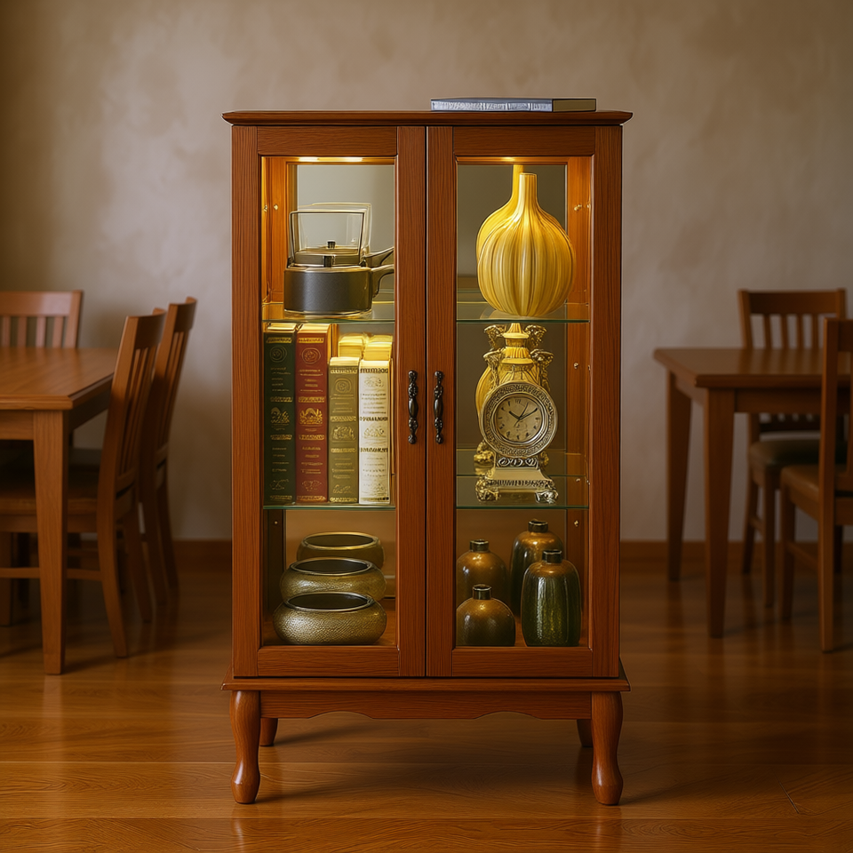ตู้โชว์ไม้โอ๊คพร้อมชั้นวางปรับระดับได้พร้อมไฟ ประตูกระจกนิรภัย แผงหลังกระจกเงา เฟอร์นิเจอร์ในบ้าน