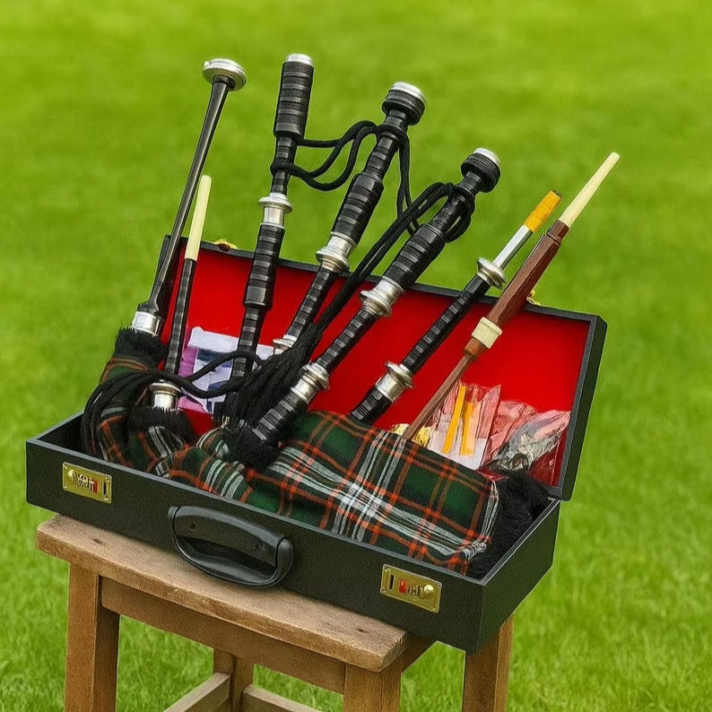 ชุดแบ็กไปป์สก็อตติชเกรทไฮแลนด์ยี่ห้อ Obexa ครบชุด ไม้โรสวูดขัดเงา พร้อมชิ้นส่วนเงิน แบบหลายคีย์ บรรจุในกล่องไม้
