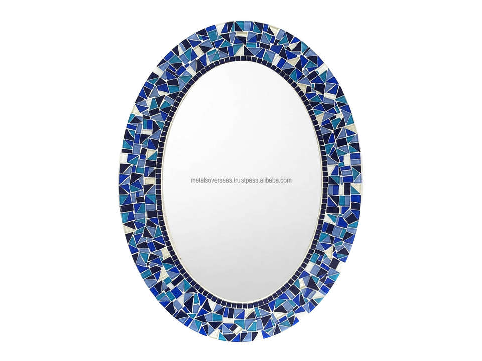 กระจกตกแต่งผนังรูปวงรีลายโมเสคสีฟ้าทะเล กรอบกระเบื้องแก้วตกแต่งอย่างหรูหรา เหมาะสำหรับแขวนผนังในห้องนั่งเล่น ห้องนอน ห้องน้ำ