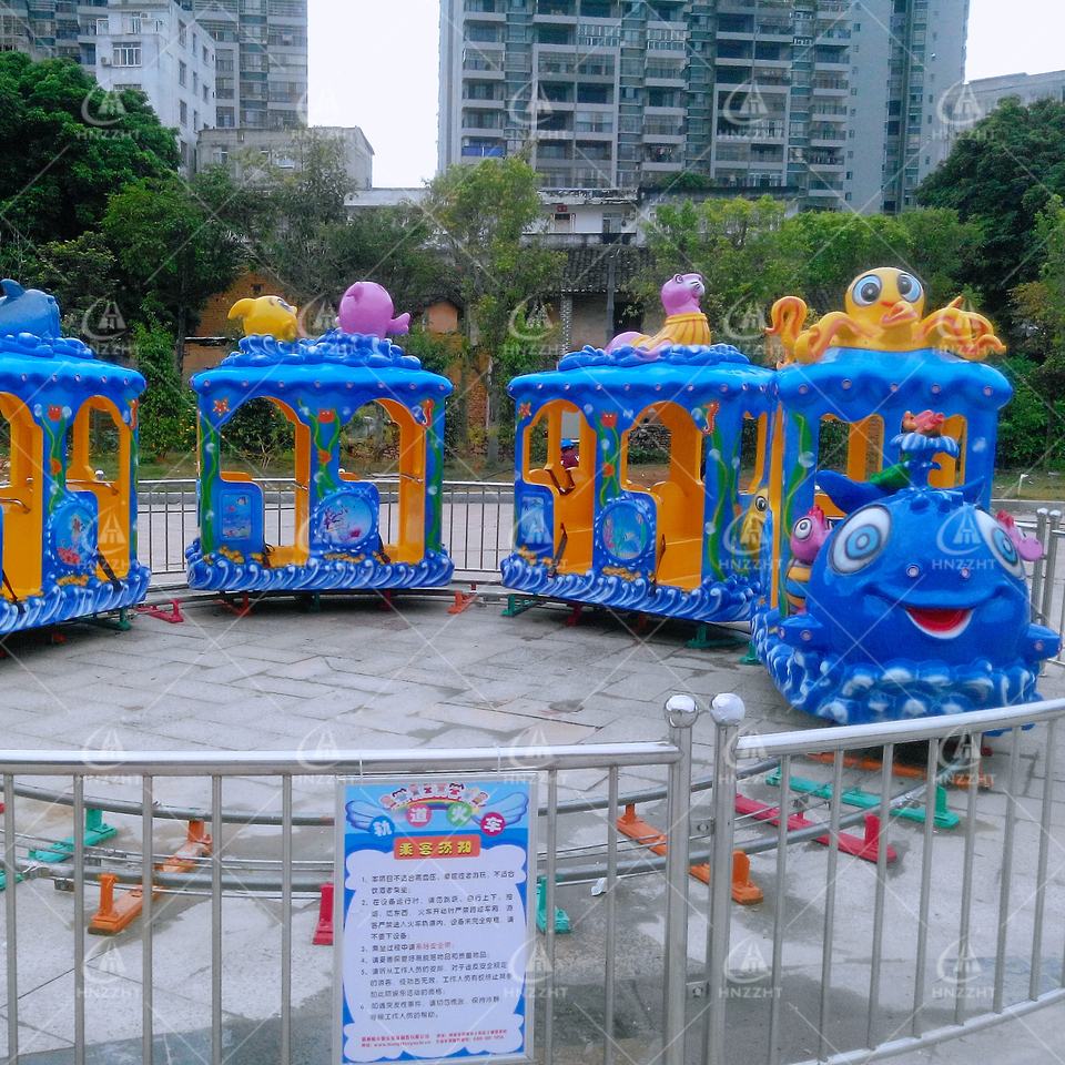 เครื่องเล่นรถไฟเด็กเล็กในสวนสนุกกลางแจ้ง อุปกรณ์สวนสนุกสำหรับครอบครัว