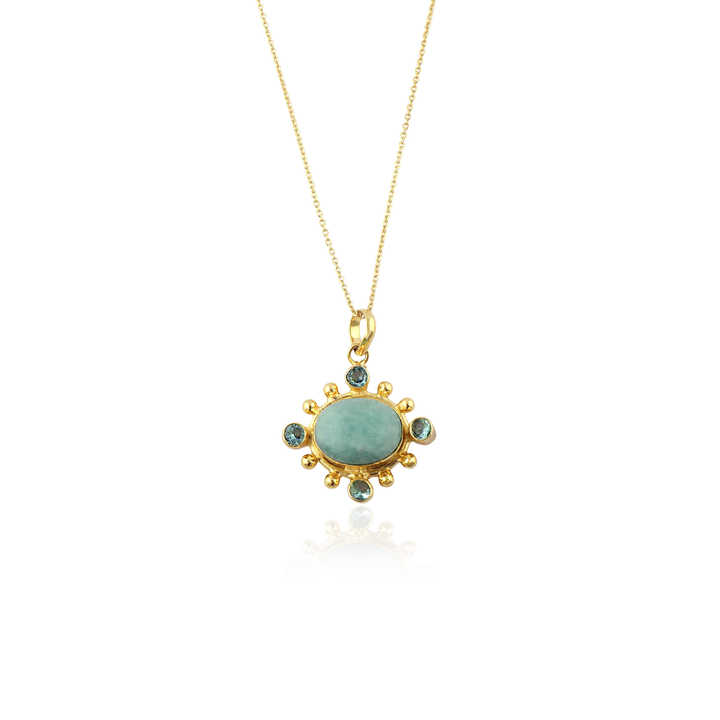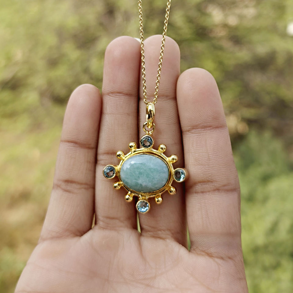 สร้อยคอจี้หินอะมาโซไนต์โทนสีมหาสมุทร ประดับด้วยควอตซ์สีฟ้าขนาดเล็ก ประกายระยิบระยับ ชุบทอง ดีไซน์ร่วมสมัย เหมาะสำหรับทั้งชายและหญิง
