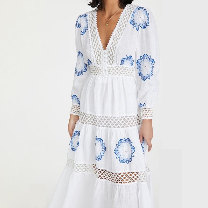 2021แม็กซี่เดรสยาวสไตล์ใหม่ปักลายดอกไม้สำหรับผู้หญิงฤดูใบไม้ผลิฤดูร้อน