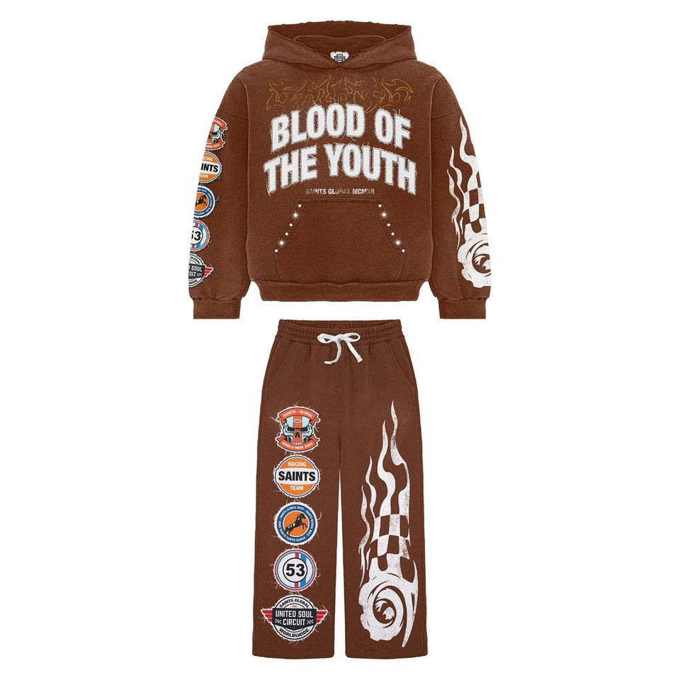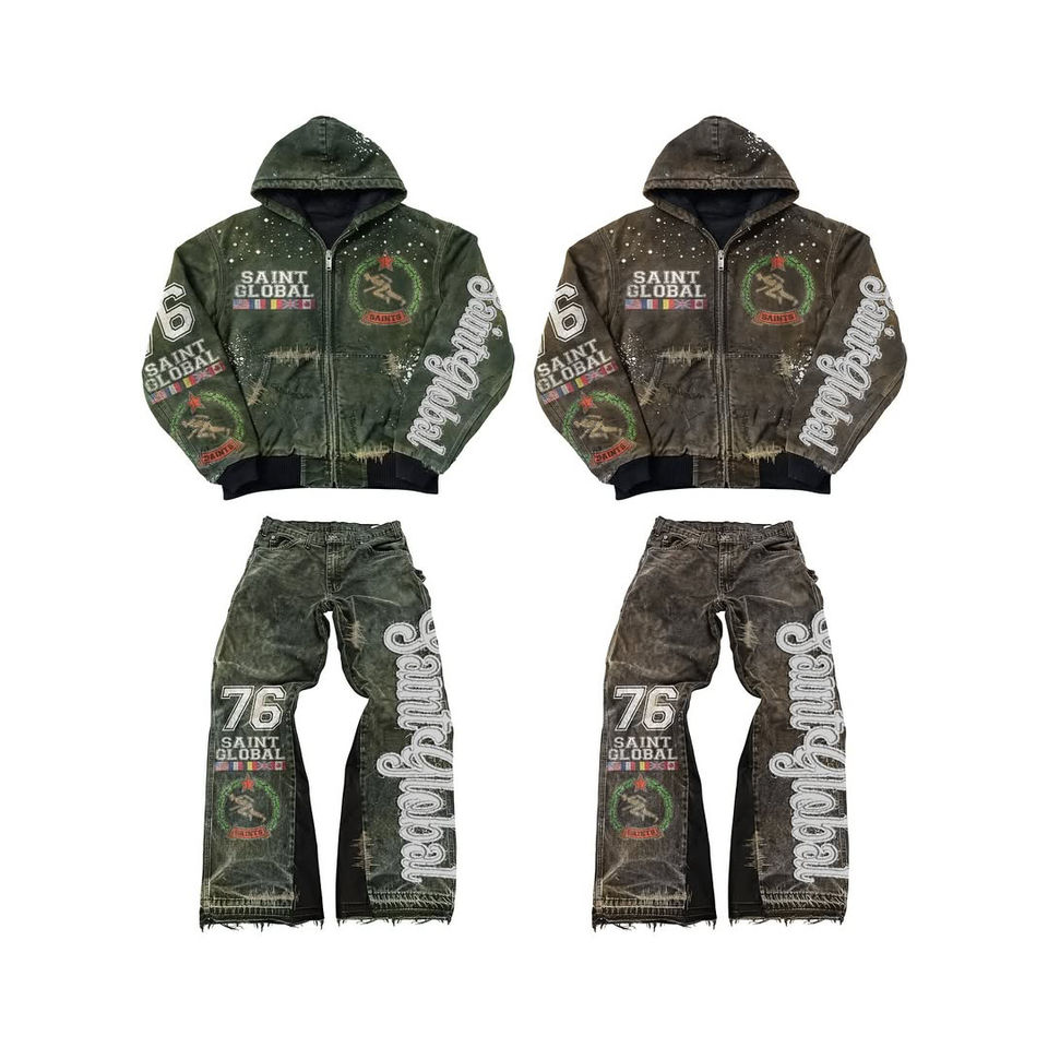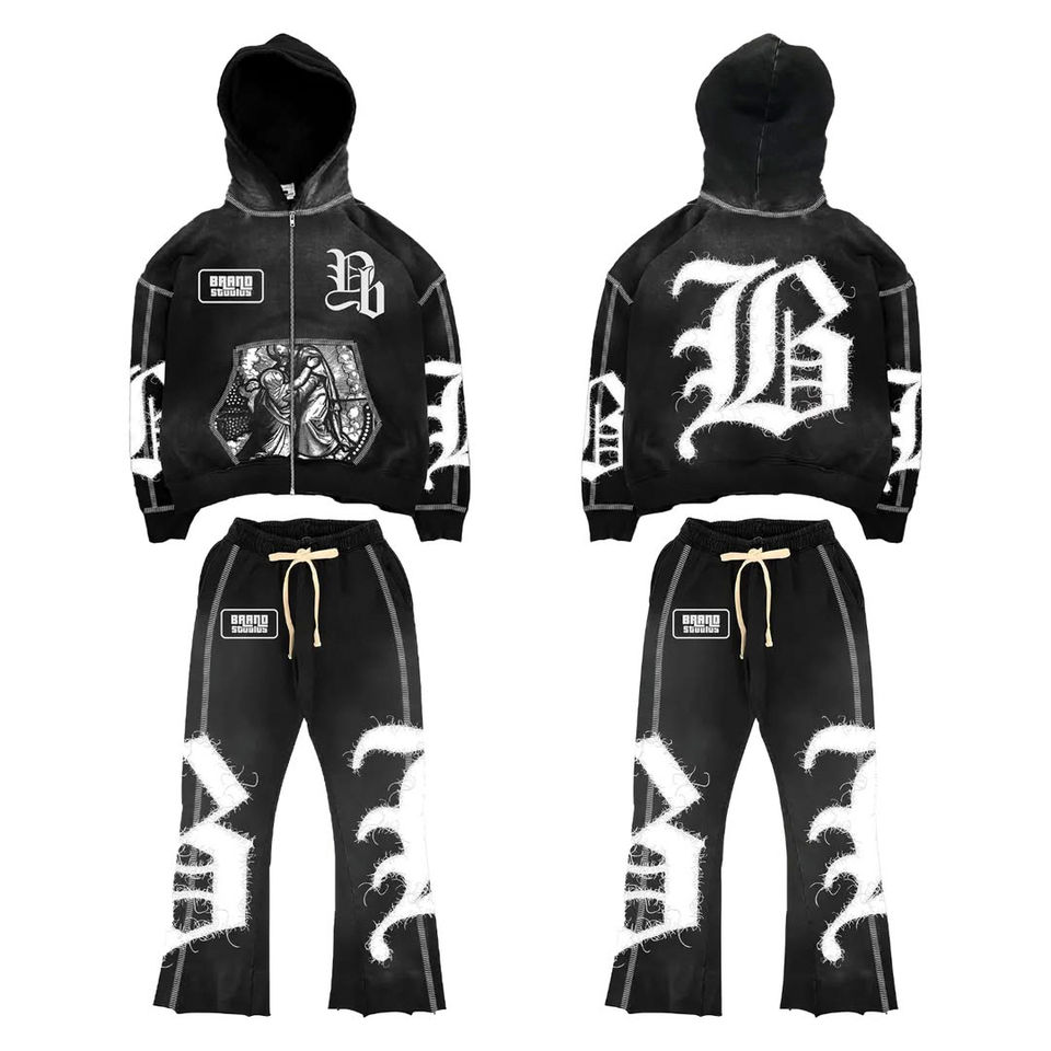 ชุดเซ็ตฮู้ดดี้และกางเกงขายาวทรงโอเวอร์ไซส์ ผ้าฝ้าย 100% แบบสั่งทำพิเศษ ตกแต่งด้วยงานปักลายขาดๆ ประดับด้วยคริสตัล