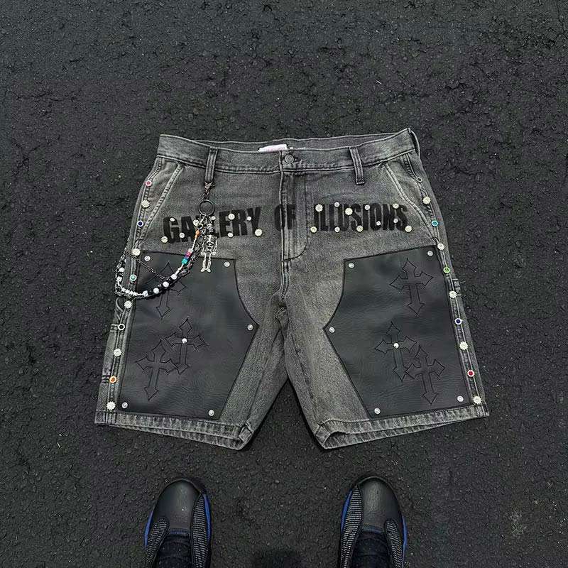 กางเกงขาสั้นกางเกงยีนส์วินเทจของผู้ชายกางเกงขาสั้นหนังปะแบบวินเทจผ้าเดนิมสำหรับผู้ชาย