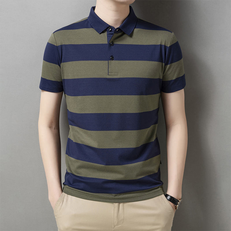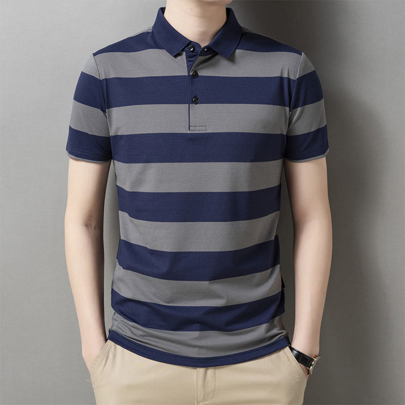 เสื้อโปโลแขนสั้นผู้ชายไซส์ใหญ่ ผ้าฝ้ายระบายอากาศดี ออกแบบโลโก้ตามสั่ง ปกเสื้อแบบมีลายทาง