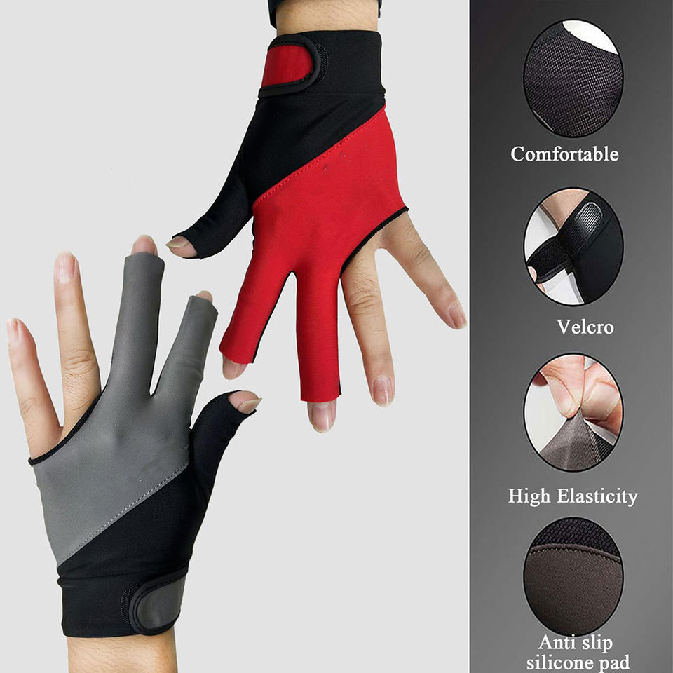 ถุงมือสนุกเกอร์คุณภาพสูงแบบ OEM ผู้ผลิตโลโก้ตามสั่ง ถุงมือสนุกเกอร์สามนิ้ว ระบายอากาศได้ดี อุปกรณ์เสริมสำหรับพูล