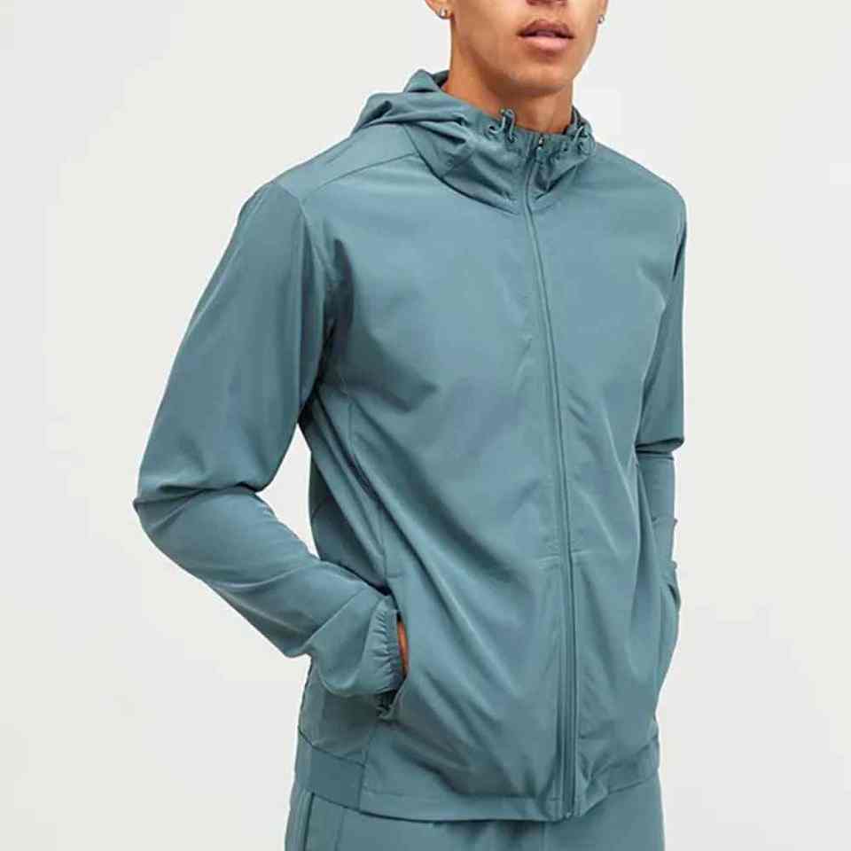 ชุดแจ็คเก็ตกันลมแบบมีฮู้ด OEM ผลิตตามสั่ง ปักโลโก้สะท้อนแสง น้ำหนักเบา ผ้าโพลีเอสเตอร์/ไนลอน แจ็คเก็ตซิป ชุดวอร์มผู้ชาย