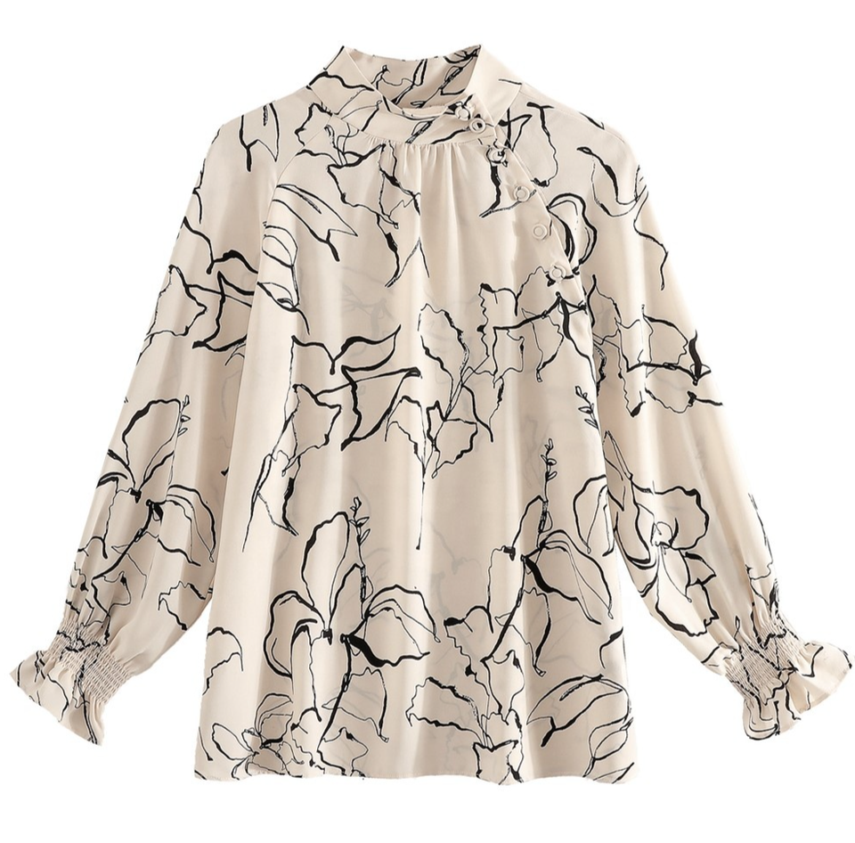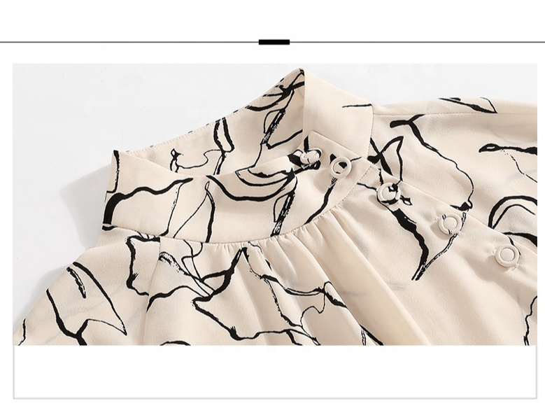 เสื้อเชิ้ตแขนยาวสำหรับผู้หญิงทำงาน ลายดอกไม้สีขาว ผ้าชีฟอง ติดกระดุม รุ่น B985