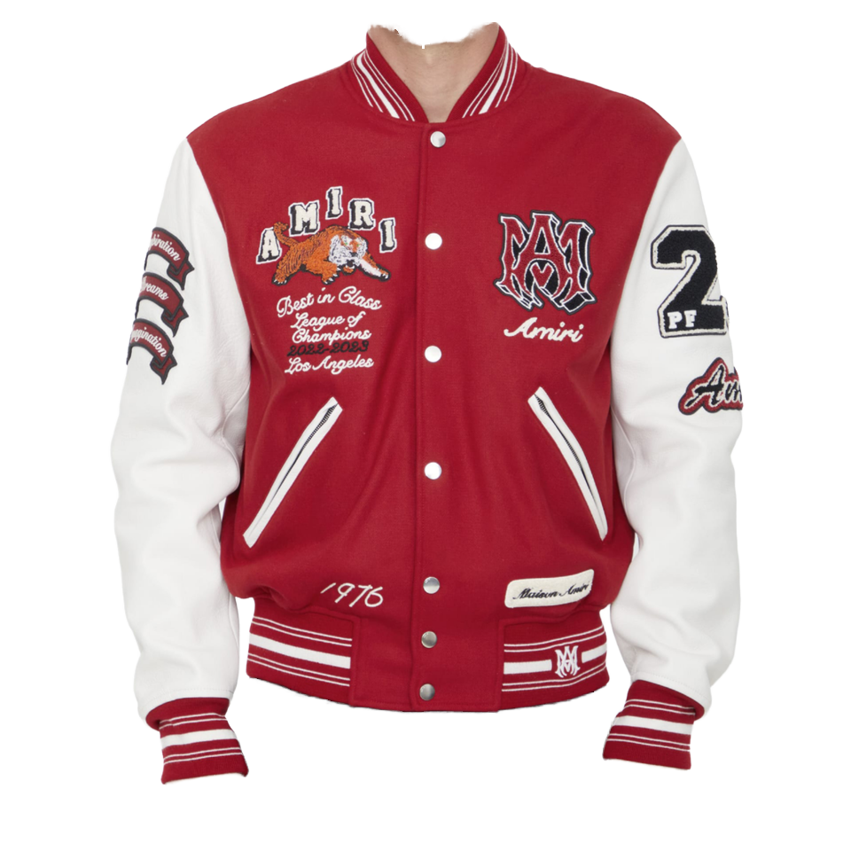 แจ็กเก็ตเบสบอลผ้าขนสัตว์แขนหนังปักลายสำหรับผู้ชายแขนเสื้อหนัง