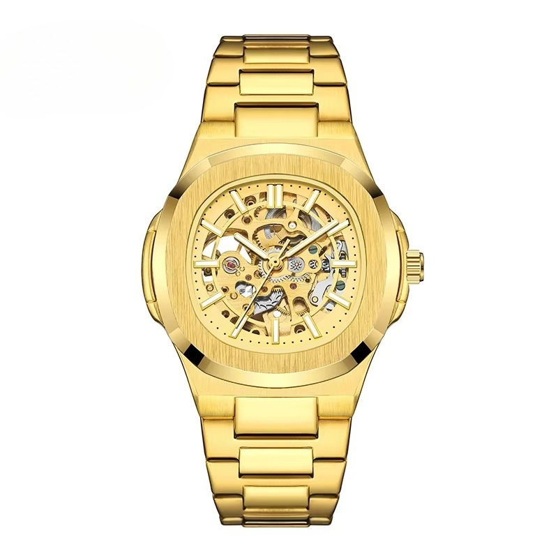นาฬิกาข้อมือผู้ชายระบบจักรกลอัตโนมัติรุ่นใหม่ล่าสุด โลโก้ Oem Odm กันน้ำ กันน้ำได้ ทนทาน สีทอง เหมาะสำหรับธุรกิจ
