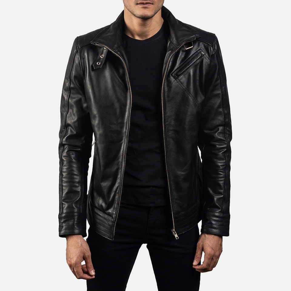 เสื้อแจ็คเก็ตหนังผู้ชายสีดำ บริการ OEM แจ็คเก็ตหนังแขนยาวสำหรับผู้ชาย