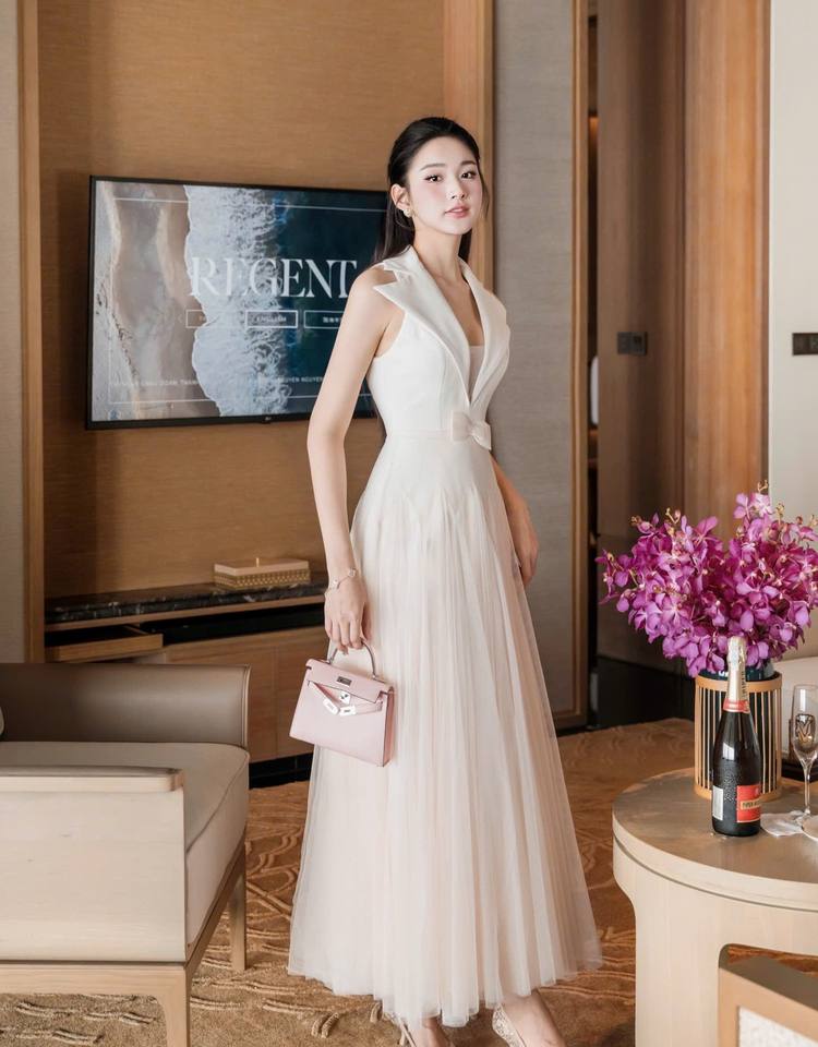 บริการ OEM ชุดเดรสยาวผ้าตาข่ายสีขาว คอวี แขนกุด ทรงเข้ารูป ผลิตจากโรงงาน คุณภาพพรีเมียม