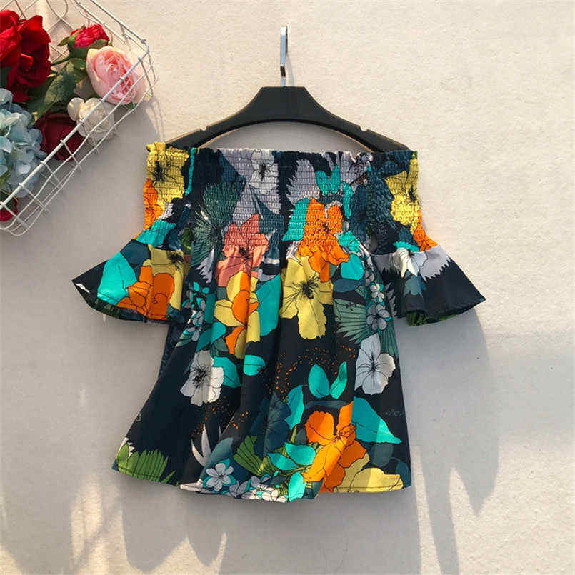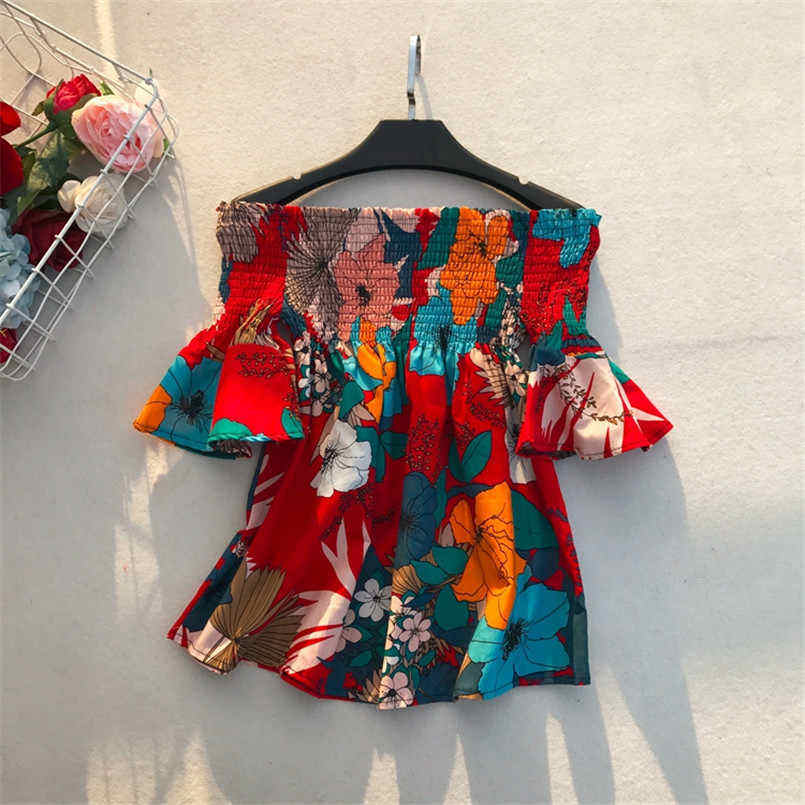 เสื้อเบลาส์พิมพ์ลายดอกไม้สไตล์โบโฮของผู้หญิง,เสื้อลำลองชายหาดแฟชั่นเปิดไหล่แขนบานแนวชาติพันธุ์ปี2019ฤดูร้อน