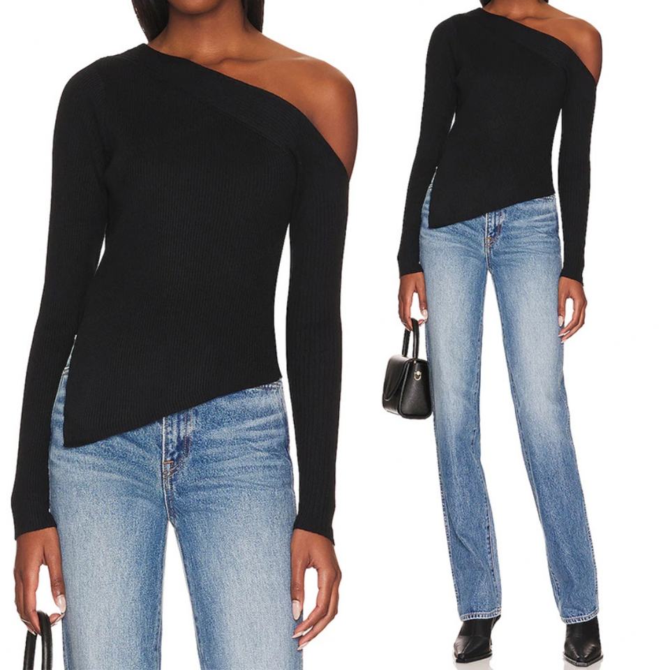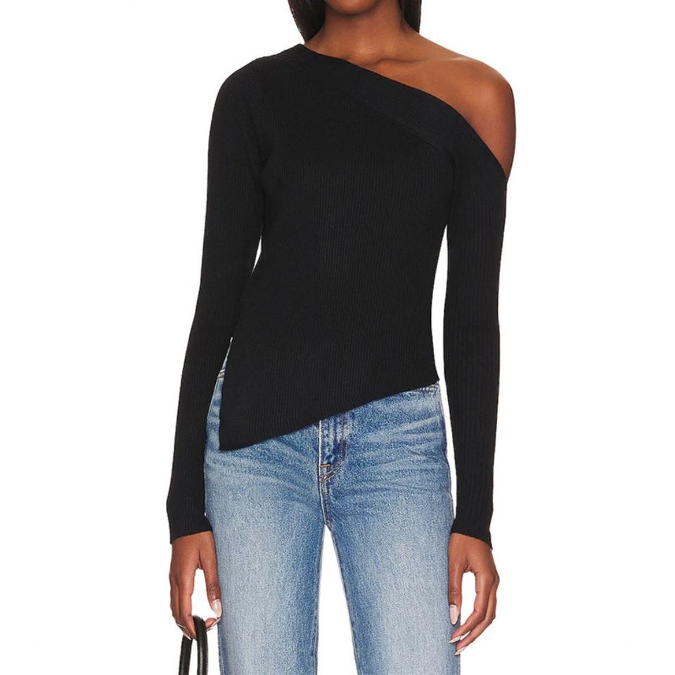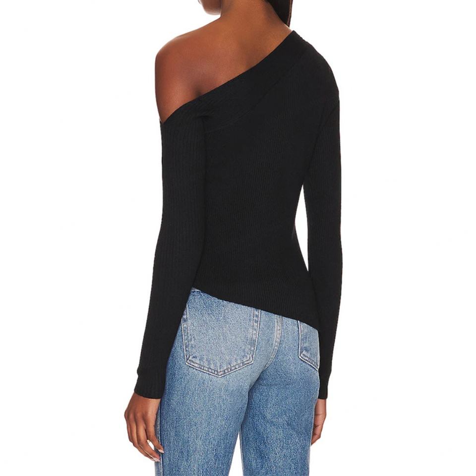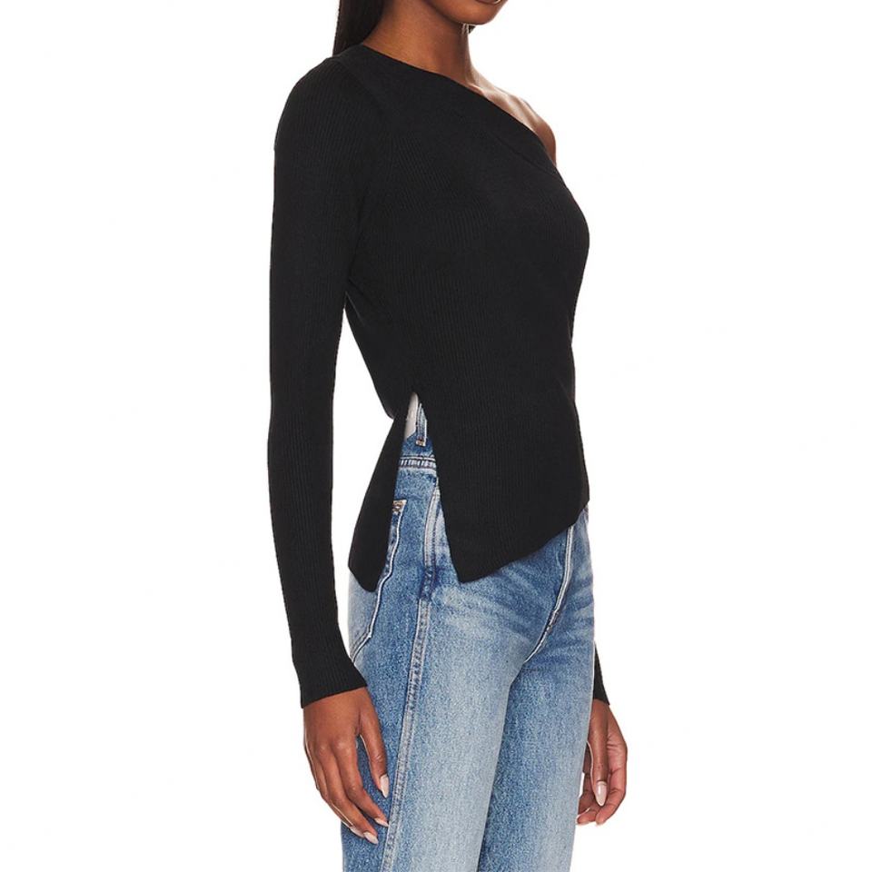 เสื้อเปิดไหล่แขนยาวทรงเอซิมเมตริก ชายเสื้อผ่าข้าง ผ้าริบถัก สำหรับผู้หญิง