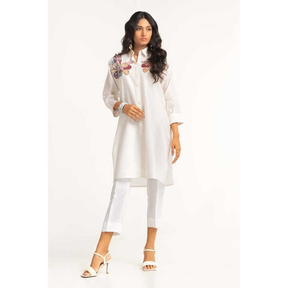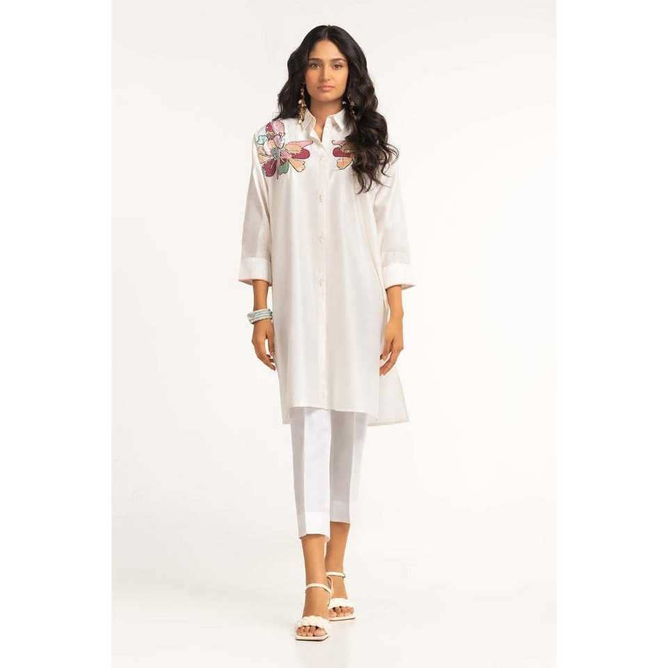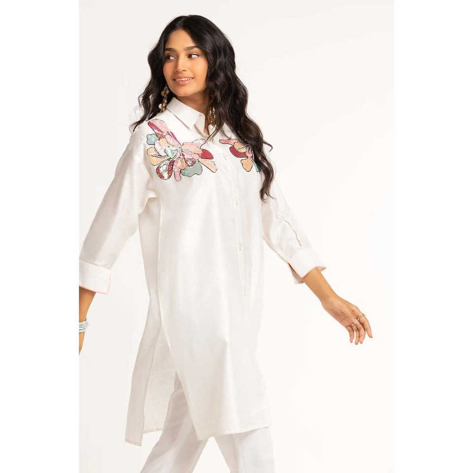 เสื้อเชิ้ตผ้าฝ้ายตาข่ายปักลายย้อมสีออฟไวท์และกางเกงขายาวสามส่วน