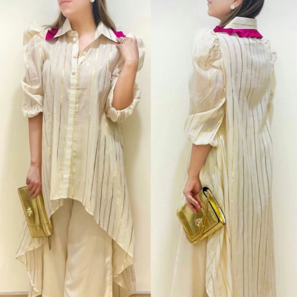 ชุดเซ็ตผ้าฝ้ายผสมลูเร็กซ์สีขาวอมเทา ดีไซน์อสมมาตร ชุดเซ็ตออกแบบโดยดีไซเนอร์ชาวอินเดีย ชุดลำลองสำหรับใส่ทุกวัน เสื้อคลุมผ้าฝ้ายลายฟอยล์และกางเกงขายาวทรงพาลาซโซ