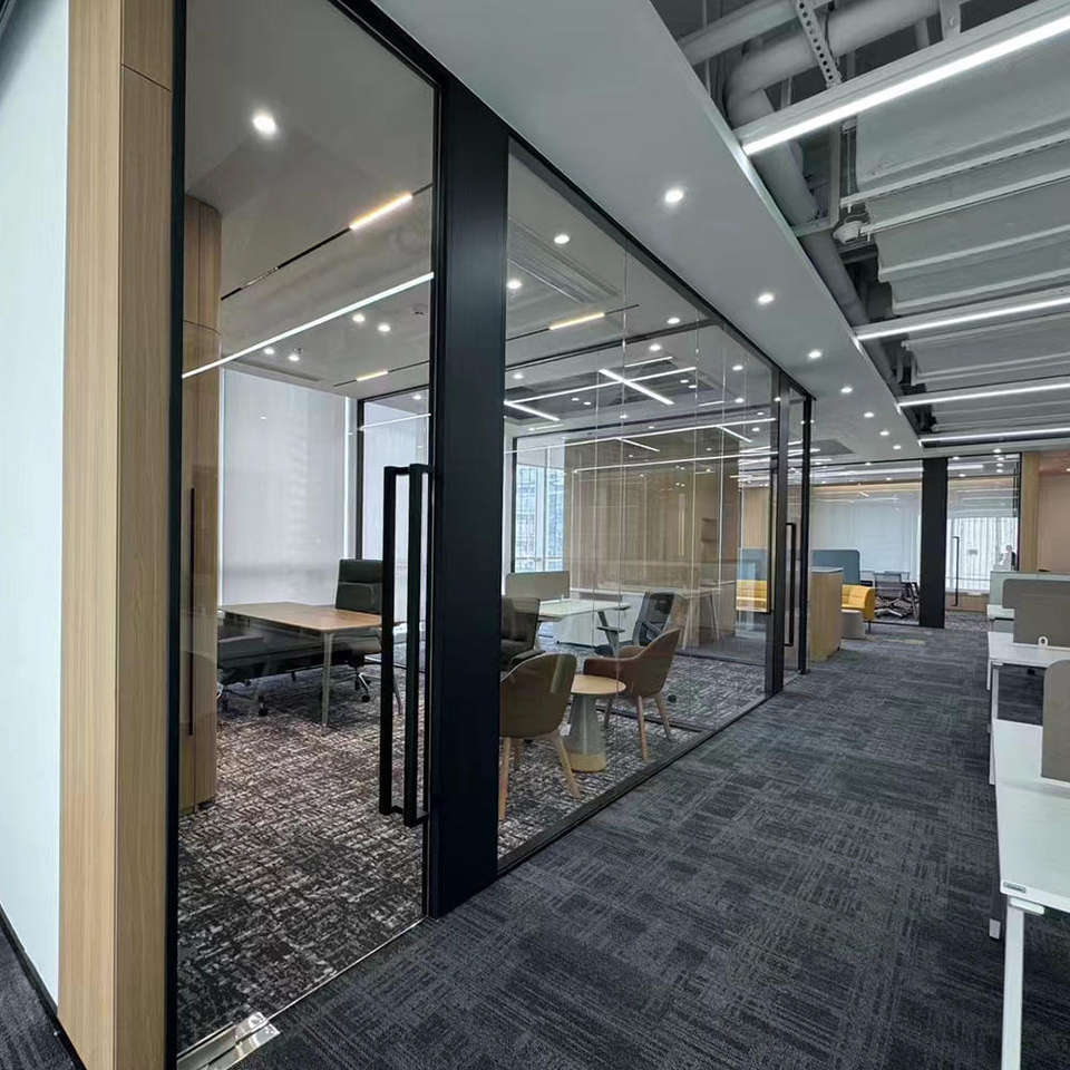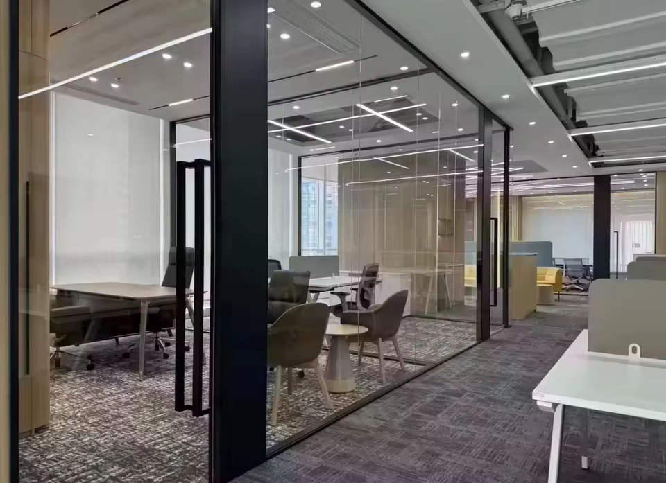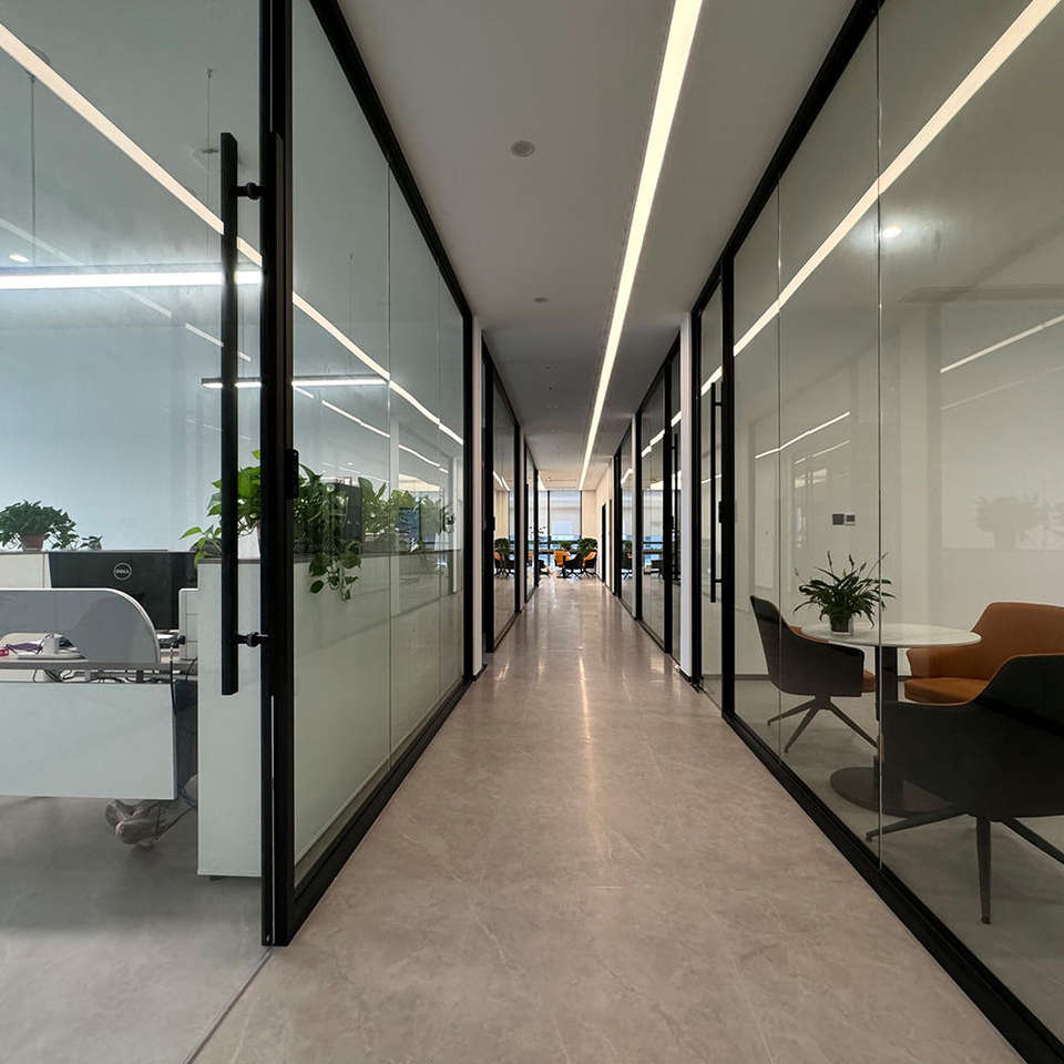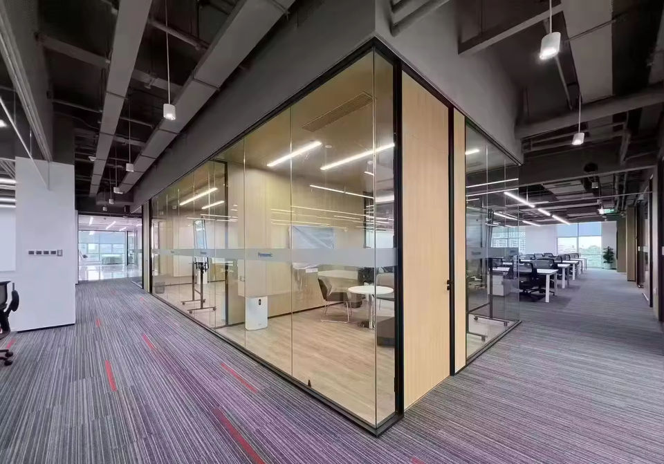 ระบบพาร์ทิชันกระจกสำนักงานและตัวแบ่งผนังกระจกแบบเคลื่อนย้ายได้ตัวแบ่งห้องอลูมิเนียมกันเสียงพร้อมแผงกระจกฝ้าแบบเลื่อน