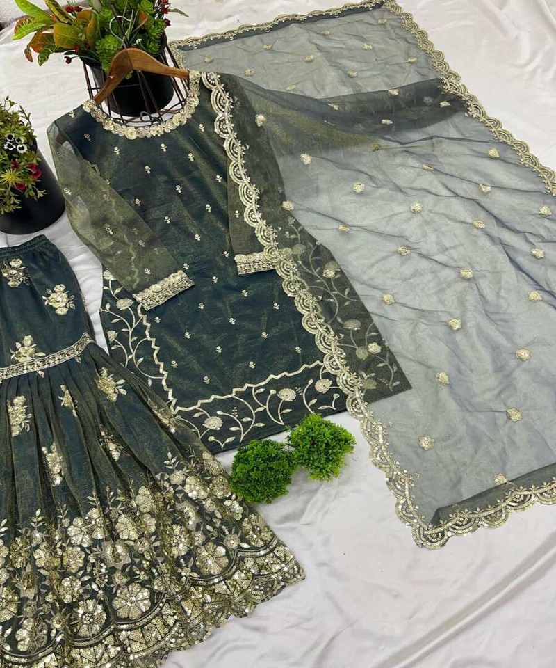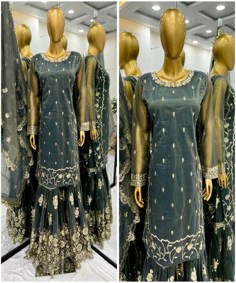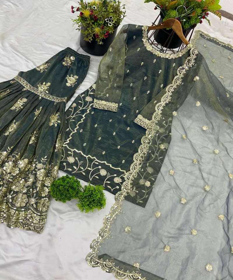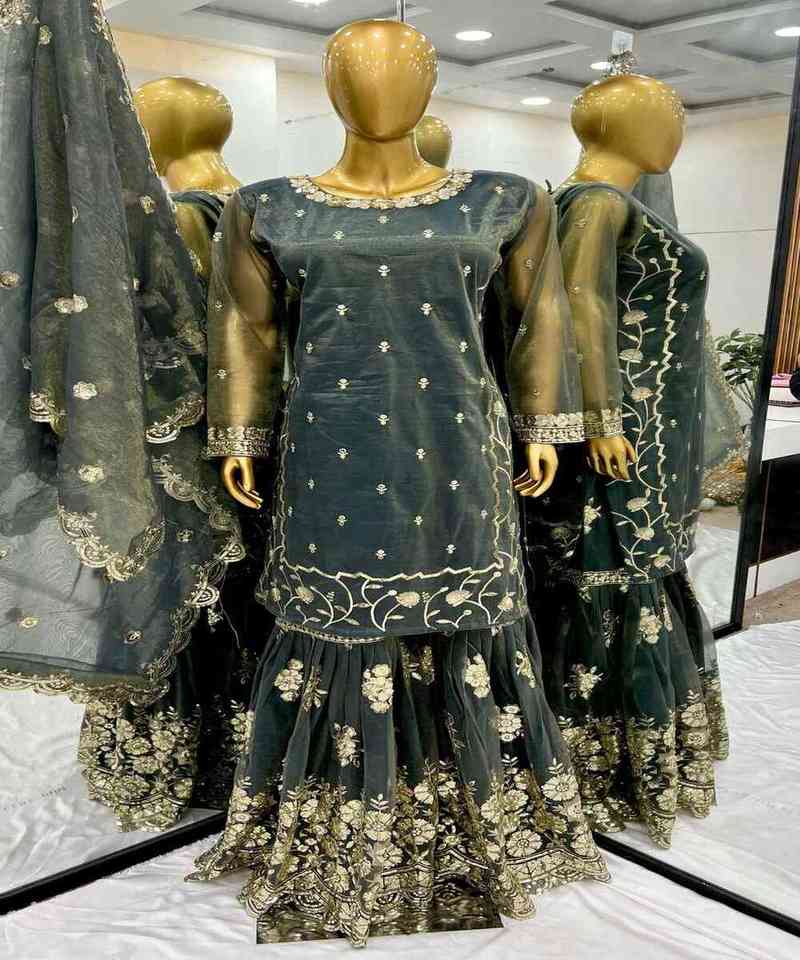 Office-ready Brocade Top Sharara Dupatta Set with Contemporary Jacquard Weave and Zari Detailing.