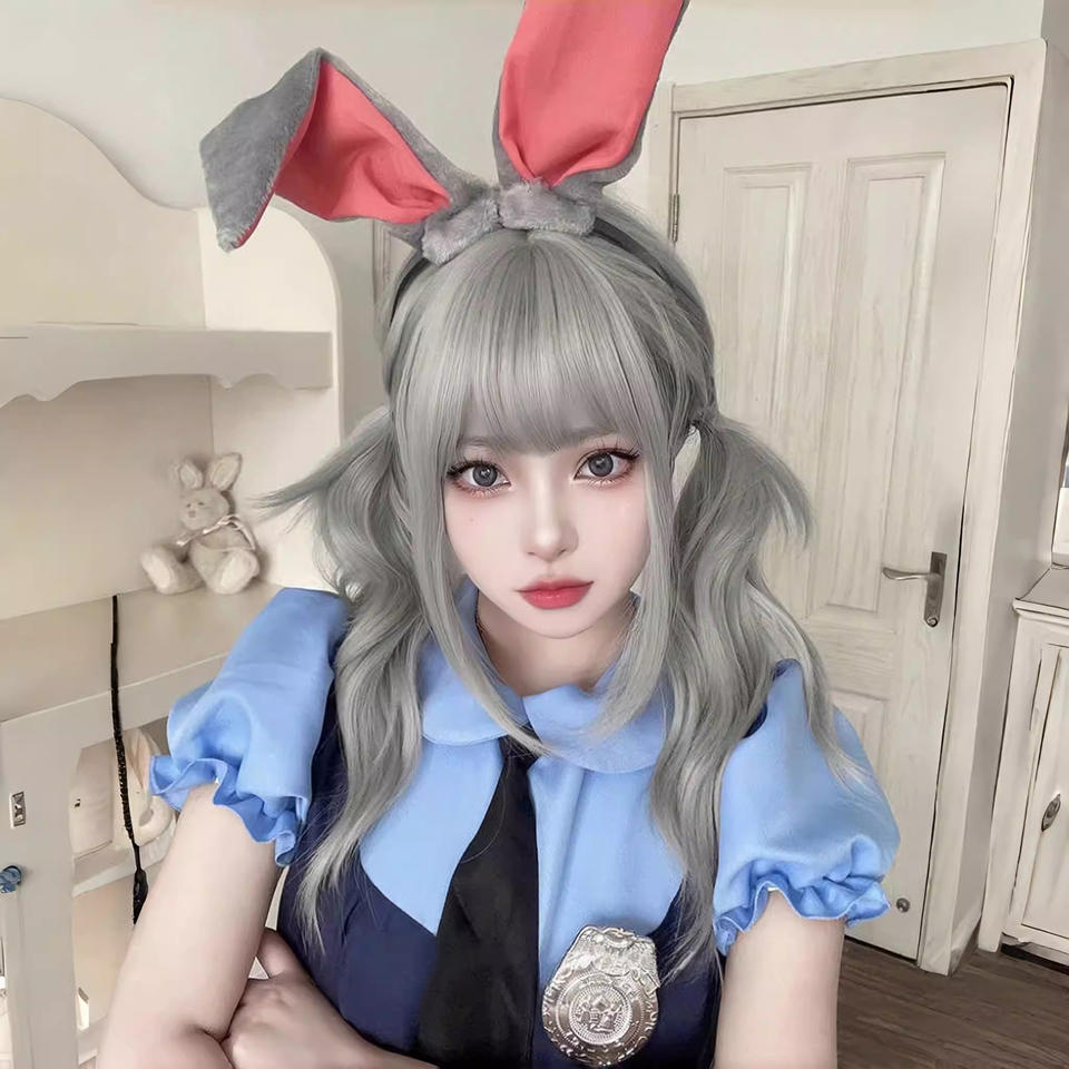 วิกผมคอสเพลย์เจ้าหน้าที่กระต่ายจูดี้ วิกผมยาวหยิกสีเทาแบบเต็มศีรษะ พร้อมผมหน้าม้าปัดข้าง ทำจากเส้นใยทนความร้อนสูง