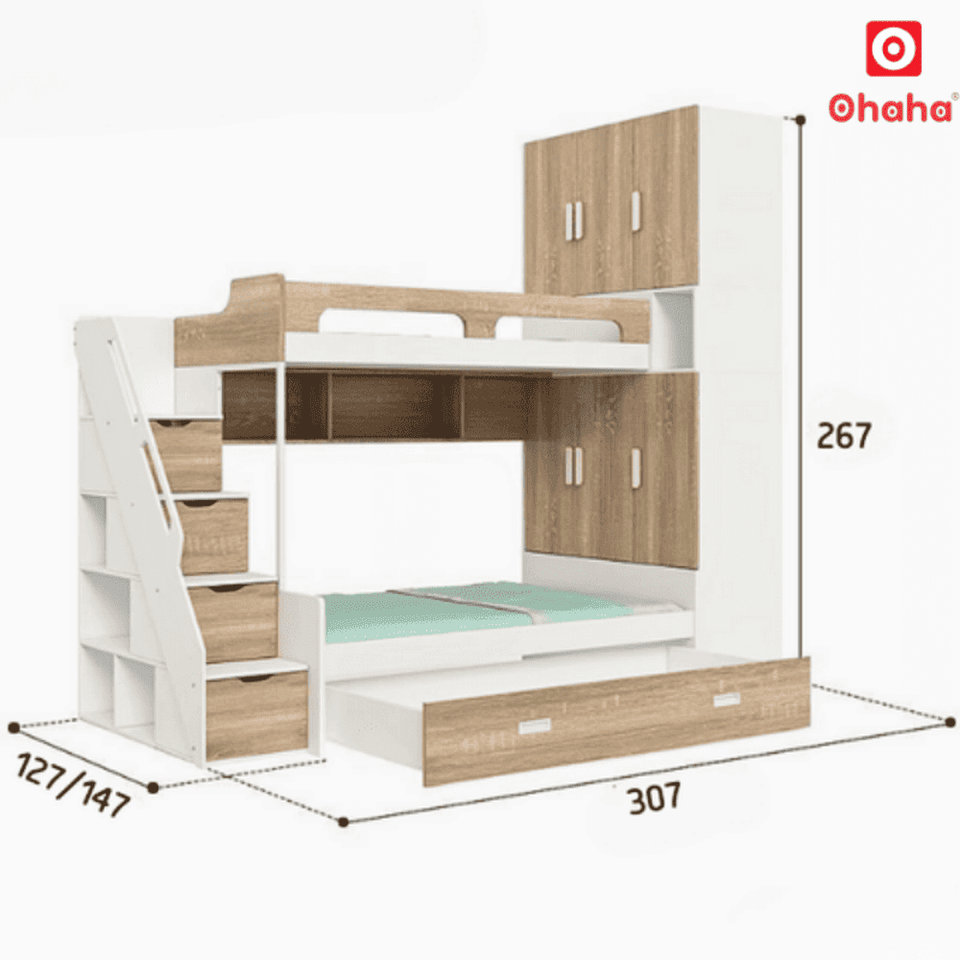 เตียงสองชั้นอัจฉริยะโอฮาฮ่า พร้อมตู้เสื้อผ้าและชั้นวางหนังสือในตัว - GTTM015
