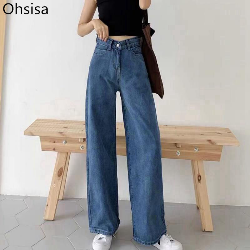 Ohsisa กางเกงยีนส์ขาตรงเอวสูงลำลองขายาวสำหรับผู้หญิงกางเกงยีนส์ขากว้างสำหรับผู้หญิงใหม่