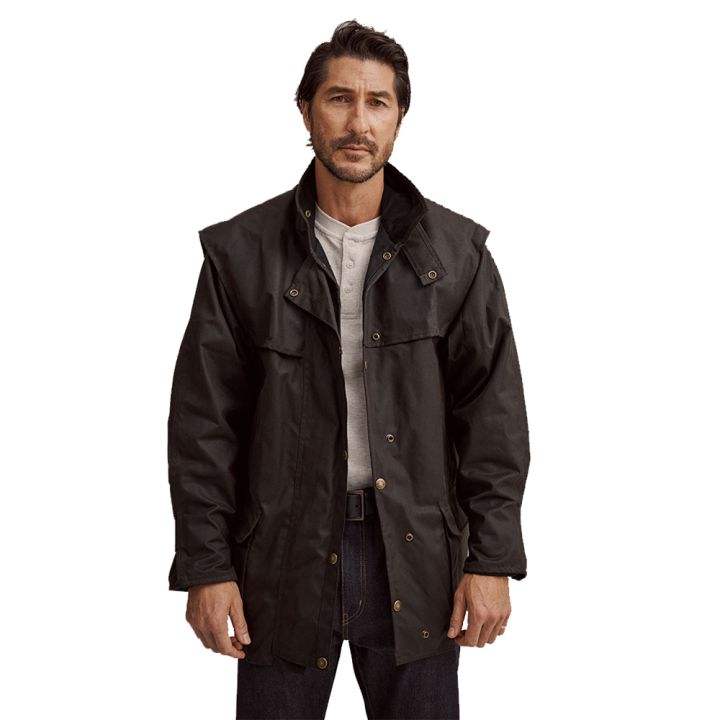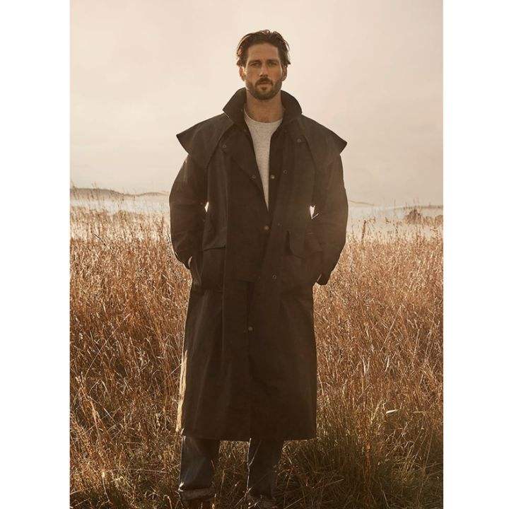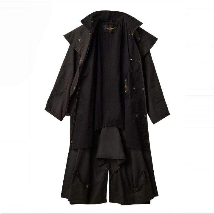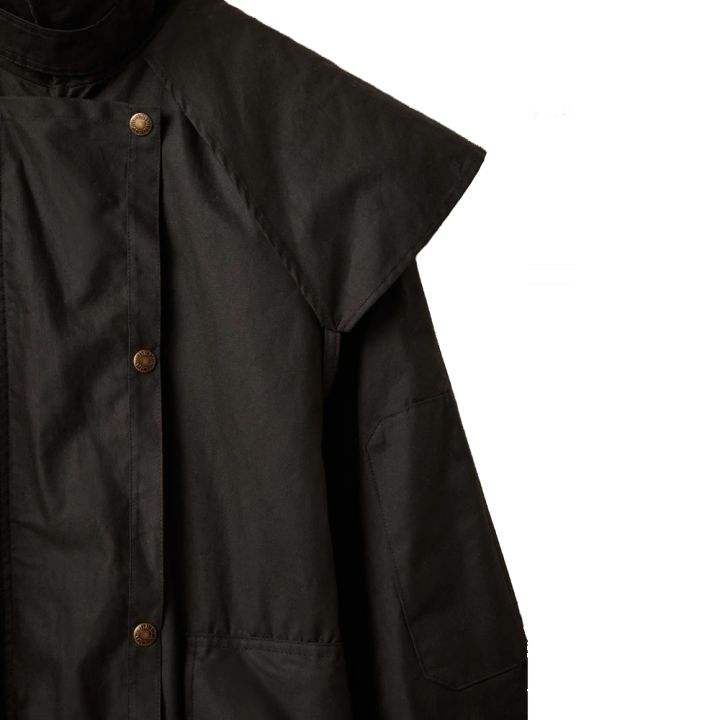 เสื้อโค้ทยาวกันน้ำแบบหนังน้ำมันบุผ้าฝ้ายหรือผ้าแคทซอล พร้อมฮู้ดถอดได้ เสื้อแจ็คเก็ตและเสื้อกั๊กแบบหนังน้ำมันสำหรับขี่ม้า