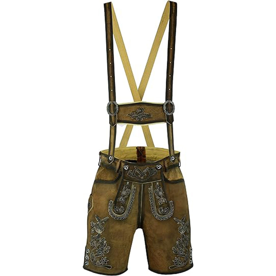 ชุดเยอรมันแท้แบบดั้งเดิมสำหรับผู้ชาย Oktoberfest Bavarian herren แบบสั้น lederhosen สีน้ำตาลพร้อมเทคนิคปัก