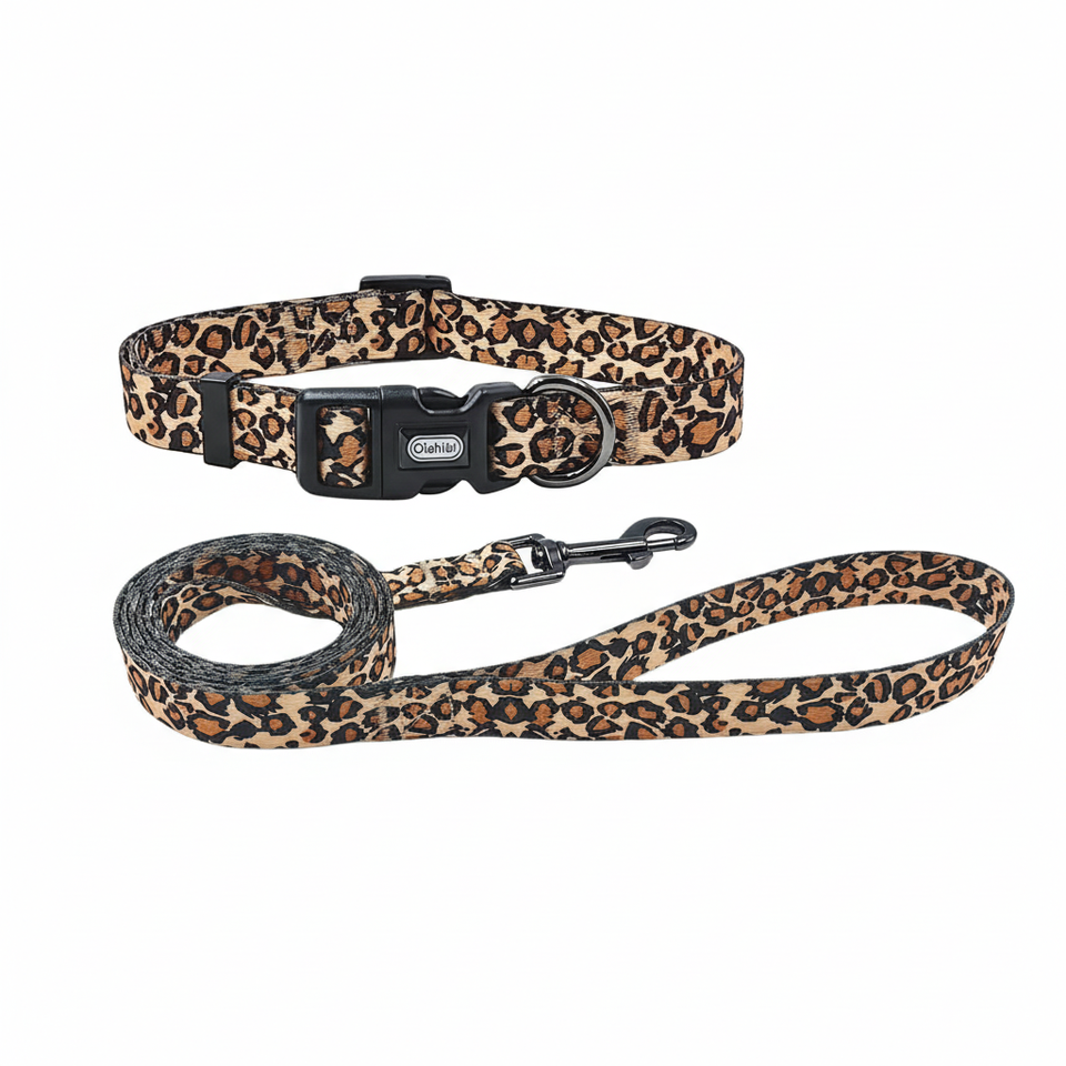 ชุดสายจูงสุนัข olahiba ลายเสือดาววัสดุโพลีเอสเตอร์ปลอกคอปรับได้และสายจูงจับคู่5Ft สำหรับสุนัขขนาดเล็ก (S สีน้ำตาล)