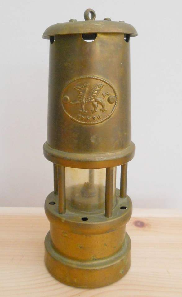 โคมไฟคนงานเหมืองทองเหลืองแบบเก่าที่มีพื้นผิวขัดเงาและมีรายละเอียดที่ซับซ้อนสำหรับห้องนั่งเล่นโบราณหรือของตกแต่งห้องเรียน