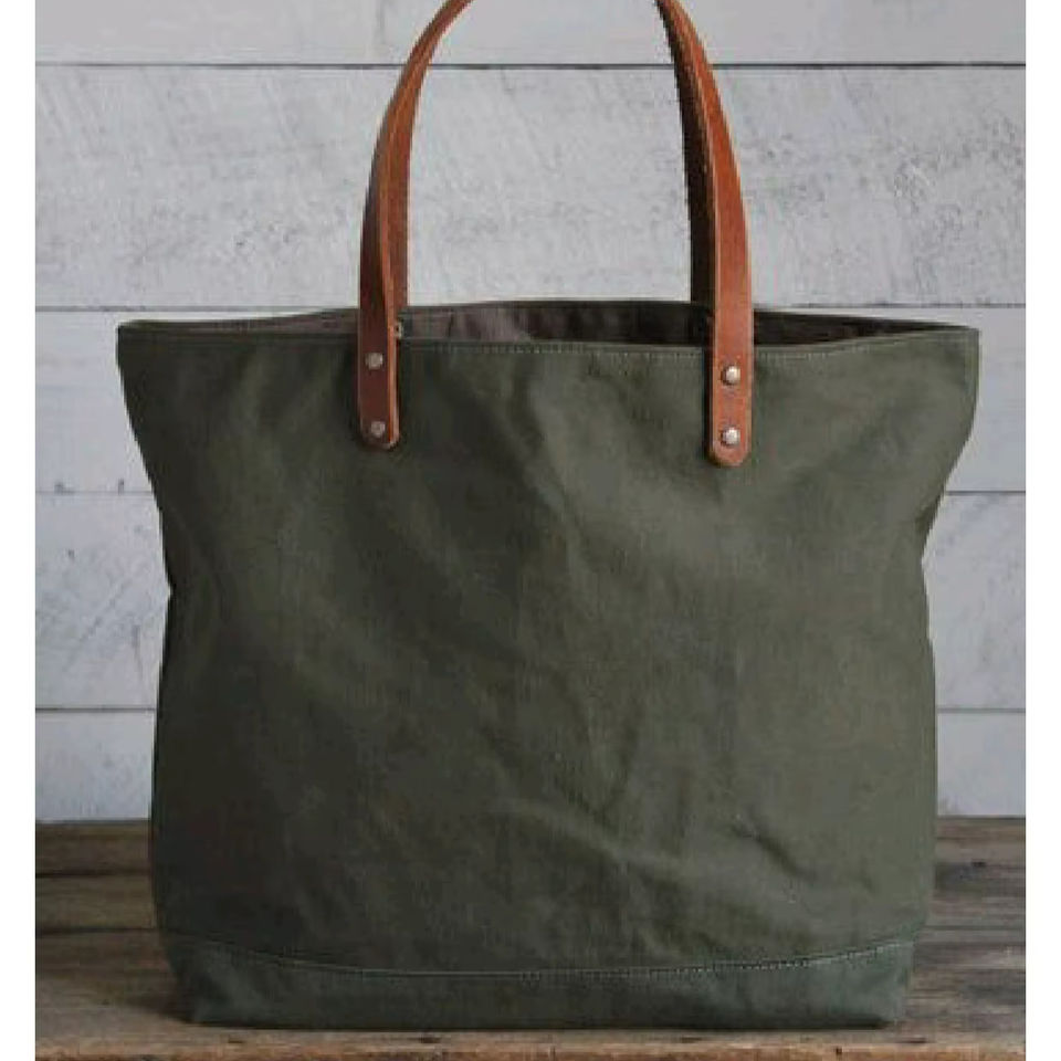 กระเป๋าผ้าแคนวาสสีเขียวมะกอกพร้อมพื้นผิวที่แข็งแรงทนทานและหูหิ้วหนัง ออกแบบมาเพื่อการใช้งานที่ทนทานสำหรับการสะพายไหล่ในชีวิตประจำวัน