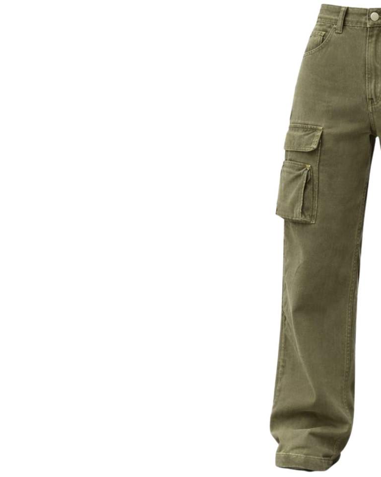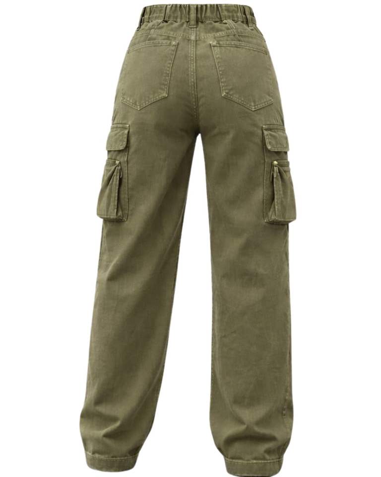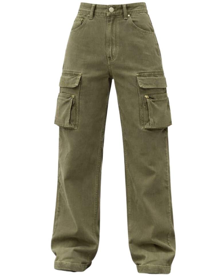 กางเกงยีนส์คาร์โก้เอวสูงสีเขียวมะกอก ทรงขากว้าง มีกระเป๋าซิป สไตล์สตรีทลำลองสำหรับผู้หญิง ทรงหลวม รับผลิตแบบ OEM