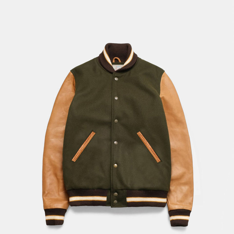 เสื้อแจ็คเก็ตวาร์ซิตี้สีเขียวมะกอกและสีแทนสำหรับผู้ชาย ทำจากผ้าขนสัตว์และหนัง สไตล์บอมเบอร์คลาสสิก พร้อมขอบยางยืดและกระดุมแป๊ก
