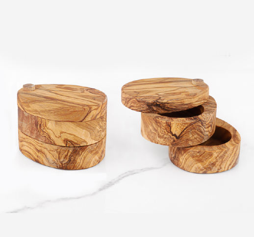 ที่เก็บเกลือสองชั้นทำจากไม้มะกอกพร้อมฝาหมุนเป็นมิตรต่อสิ่งแวดล้อมและซักด้วยมือได้อย่างทนทานเท่านั้น