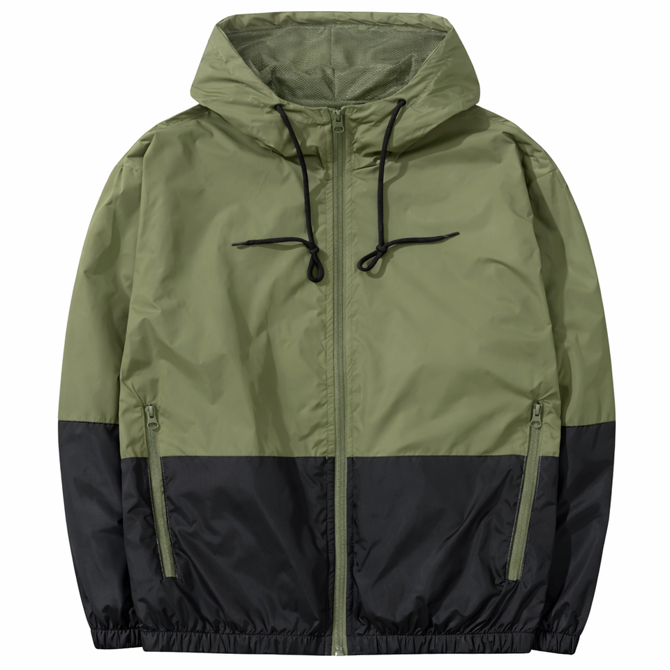 เสื้อแจ็คเก็ตกันลมน้ำหนักเบาสีเขียวมะกอกและสีดำสำหรับทุกเพศ | เสื้อแจ็คเก็ตกันน้ำกันลมมีฮู้ดสำหรับกิจกรรมกลางแจ้ง ทำจากโพลีเอสเตอร์