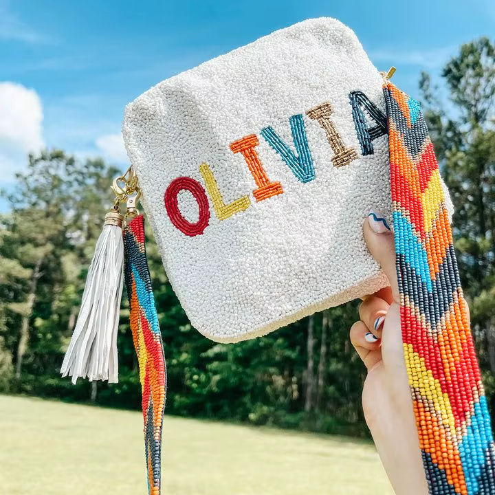 กระเป๋าถือสะพายข้างปักลาย Olivia ประดับลูกปัดทรงสี่เหลี่ยม ทำด้วยมือ พร้อมสายสะพายลาย Chevron หลากสี กระเป๋าสะพายสำหรับผู้หญิง