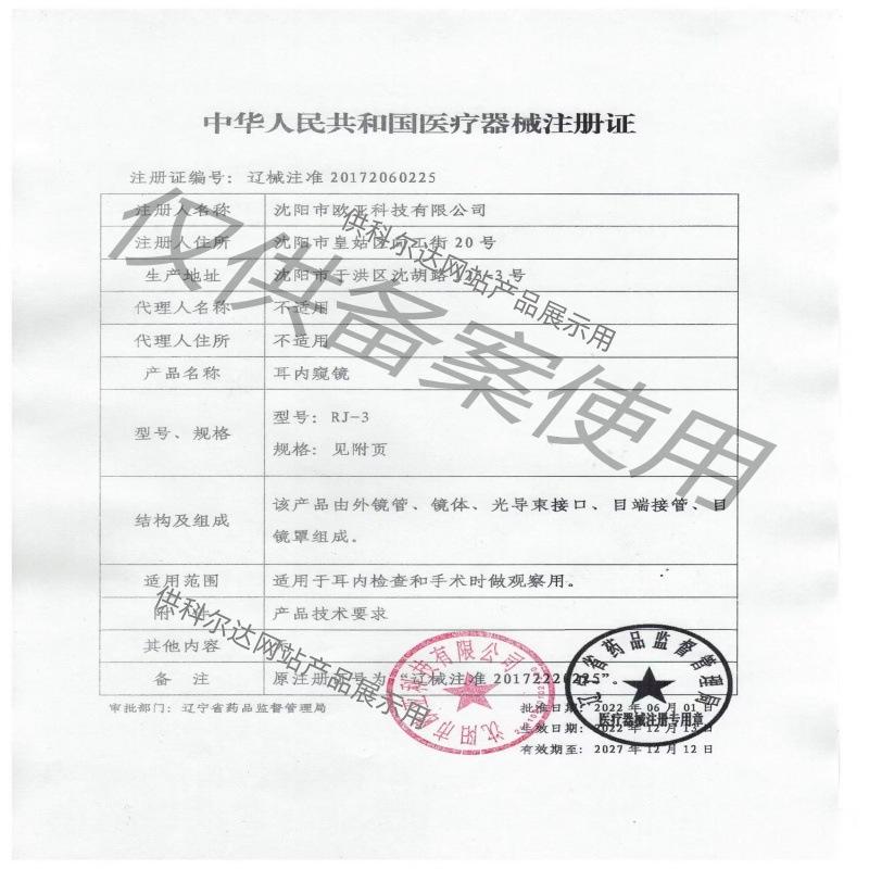 เลขทะเบียนยา (เครื่องมือแพทย์):ใบรับรองการขึ้นทะเบียนเครื่องมือแพทย์เหลียวหนิง 20172060225