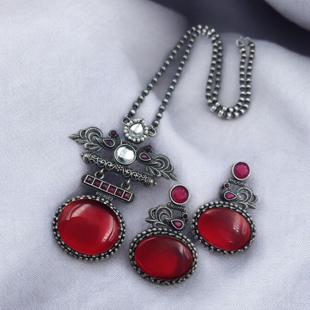 OM ชุดสร้อยคอคริสตัลสีแดงดีไซน์เนอร์แบบชนเผ่าทองเหลืองออกซิไดซ์สำหรับงานแต่งงานและงานปาร์ตี้