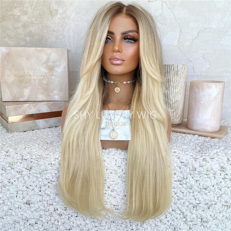 สีออมเบรแอชแพลตตินัมบลอนด์และไฮไลท์ # วิกผมแท้ 60 ชิ้น วิกผมลูกไม้แบบเต็มศีรษะ 360 องศา ไม่ต้องใช้กาว วิกผมลูกไม้แบบ HD เต็มศีรษะ พร้อมผมอ่อนบริเวณไรผม