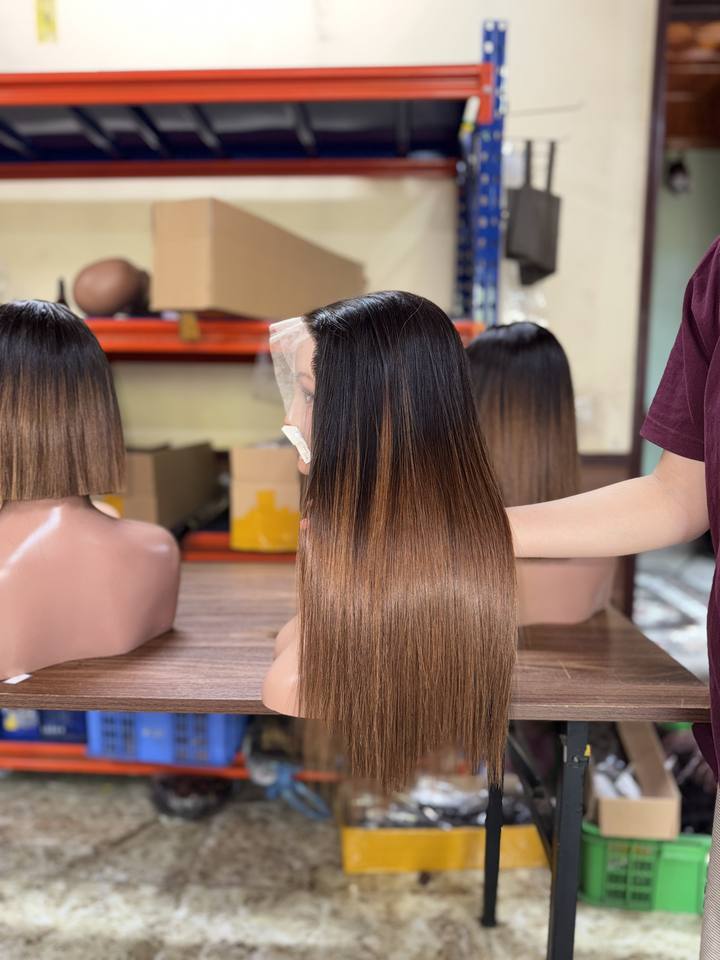 วิกผมบ๊อบผมแท้เวียดนามแบบตรงธรรมชาติ ความหนาแน่นสองเท่า เกรด 12A แบบออมเบร บราวน์ พร้อมปลายผมสีน้ำตาล ฐานลูกไม้ HD ขนาด 5x5 และ 13x4