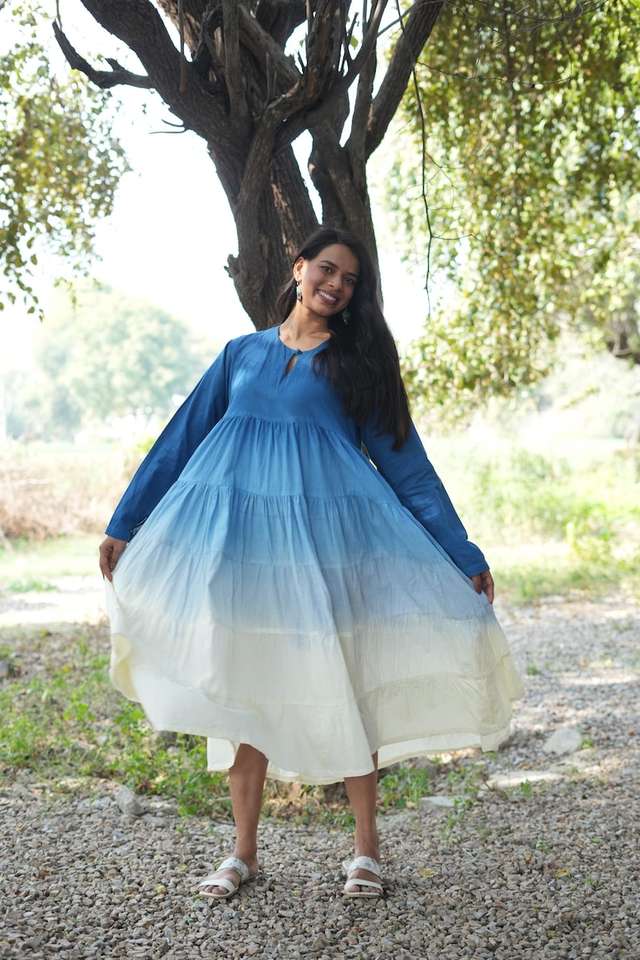 เดรสยาวผ้าฝ้ายออมเบรแบบเป็นมิตรต่อสิ่งแวดล้อม ระบายอากาศได้ดี ทรงไหล่ระบายแบบโบโฮ หรูหรา สไตล์คาฟตัน ย้อมสีไล่ระดับ ทรงบาน เหมาะสำหรับฤดูร้อนและฤดูใบไม้ผลิ
