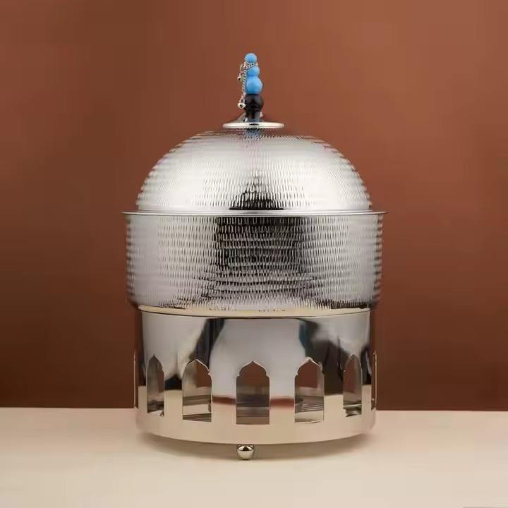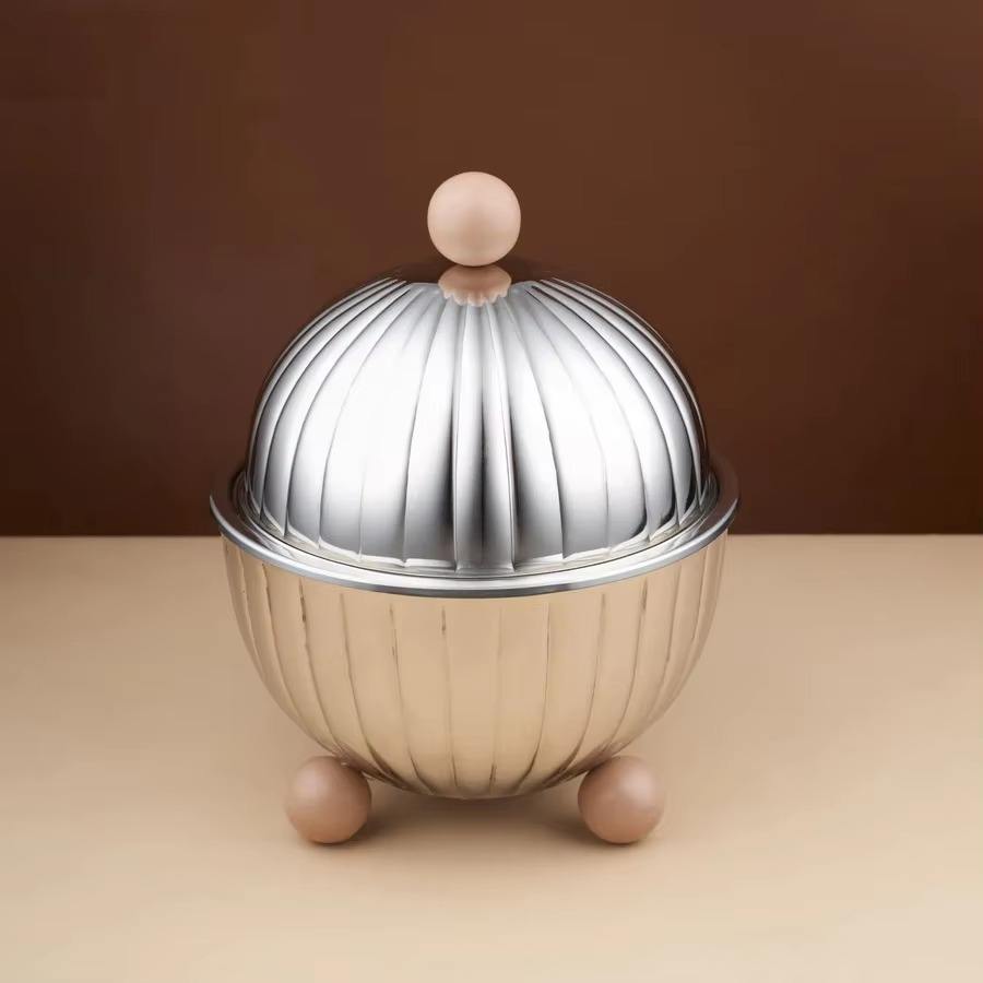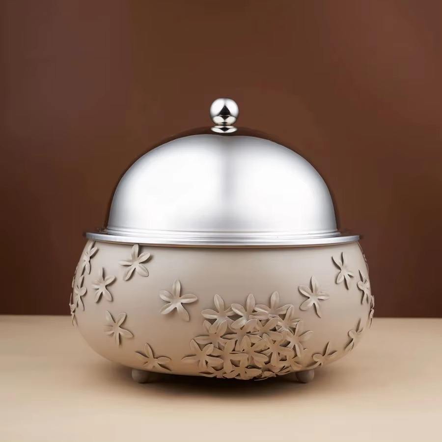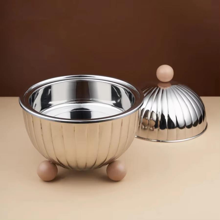เครื่องอุ่นอาหารทรงกลมมีฝาปิดสเตนเลสสตีลสีเงินเคลือบด้วยผงสีครีม