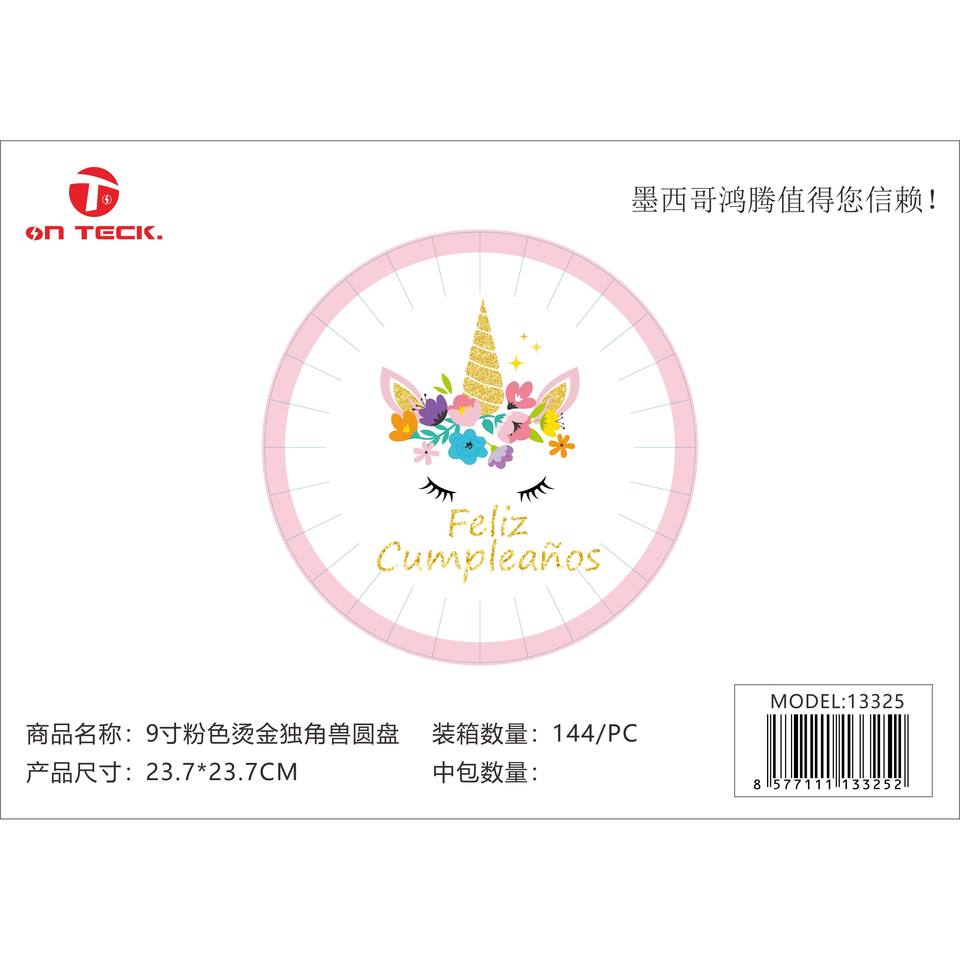 จานกลมยูนิคอร์น ออนเทค ซา เดอ ซีวี ขนาด 9 นิ้ว สีชมพู ประดับฟอยล์ทอง จานของหวาน ทนทาน สำหรับตกแต่งงานปาร์ตี้
