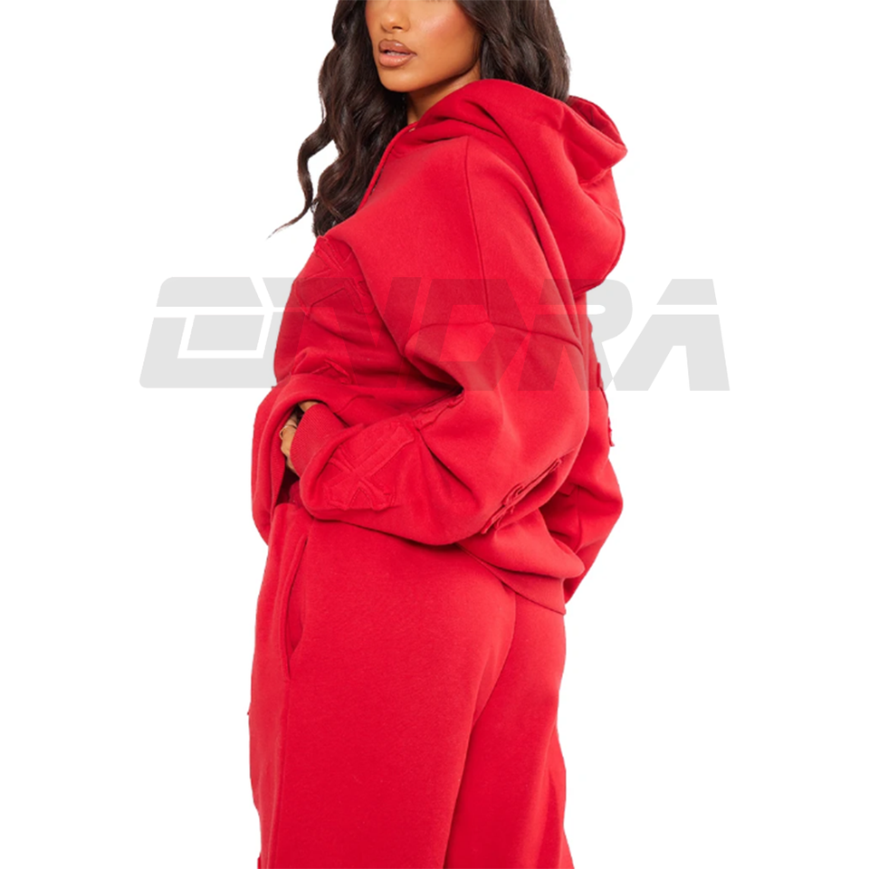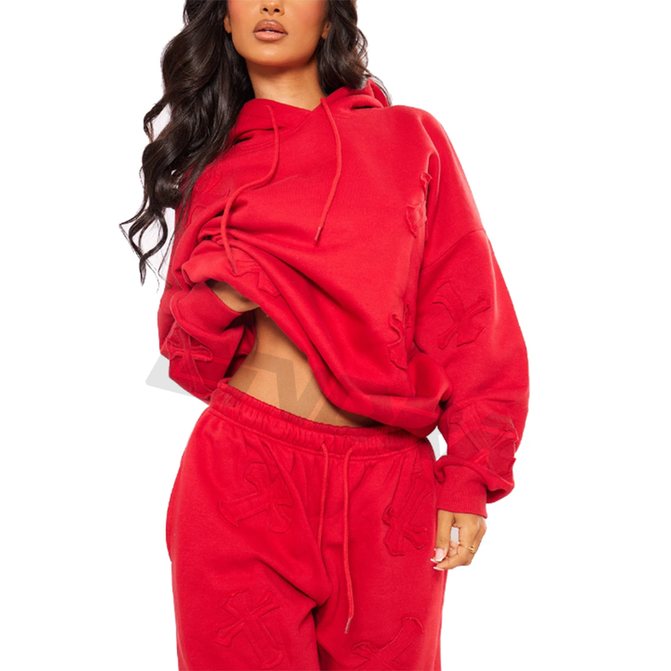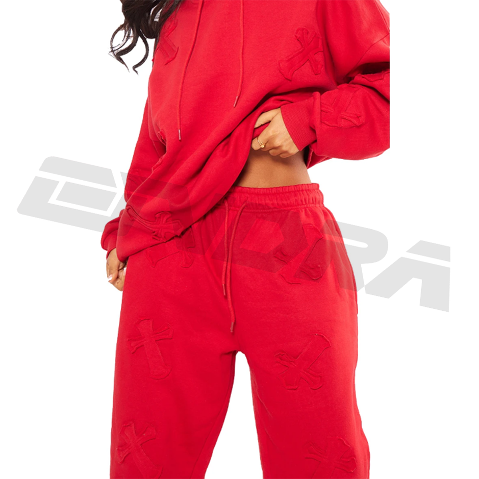 Ondra ชุดวอร์มปักลายกากบาทสีแดงเล็กกระทัดรัดมีฮู้ดและกางเกงสวมใส่สบาย
