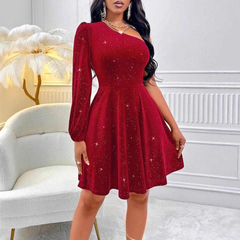 เดรสแฟชั่นผู้หญิงแขนยาวแบบไหล่เดียวสีพื้นทรงสวิง