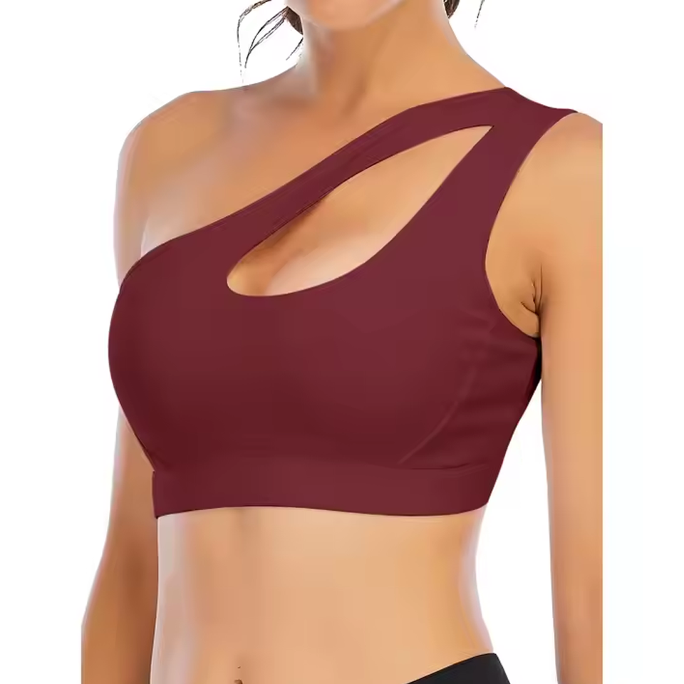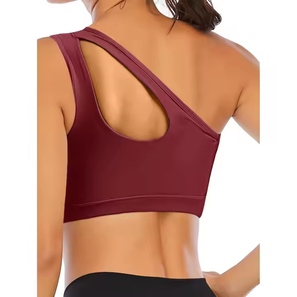 ยกทรงกีฬาเปิดไหล่หนึ่งข้างสำหรับผู้หญิงเสื้อกล้ามเอวลอยเล่นโยคะเสริมทรงยาวปานกลางพร้อมบราเล่นกีฬาในตัว