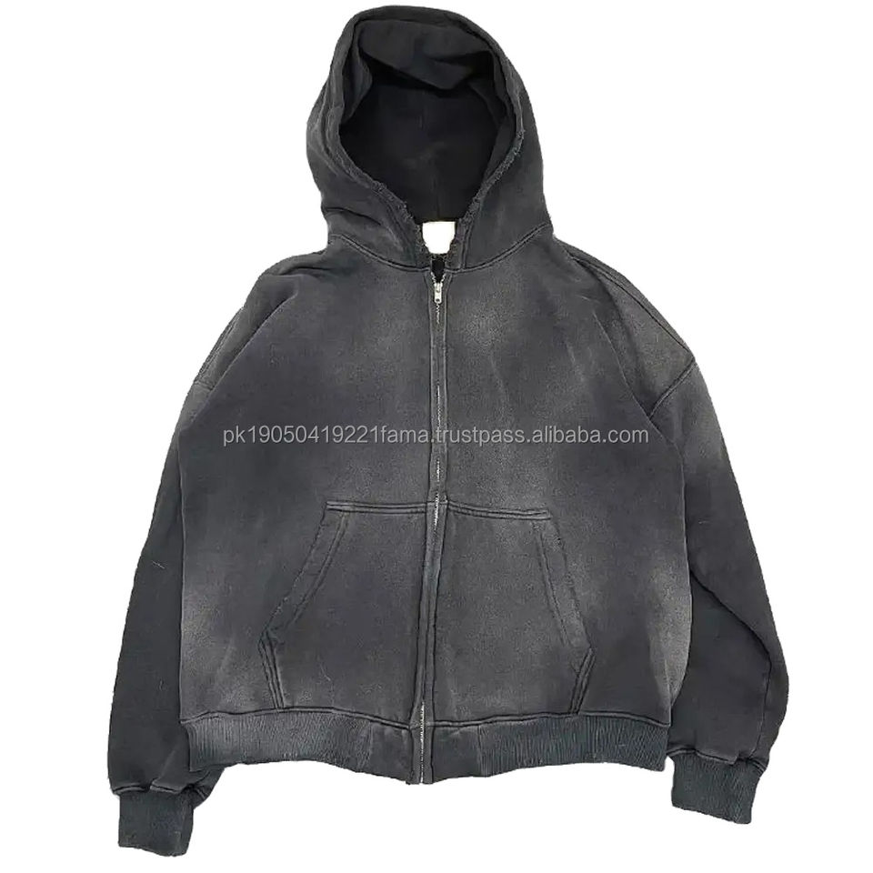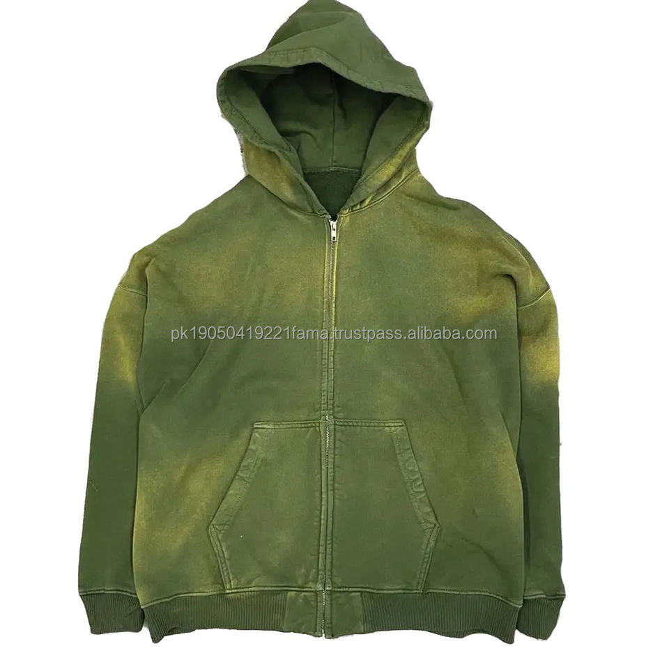 เสื้อมีฮู้ดของผู้ชายสีทึบโอเวอร์ไซส์แบบมีซิปเสื้อมีฮู้ดสำหรับล้างไหล่และกรดสีทึบออกแบบได้ตามต้องการ