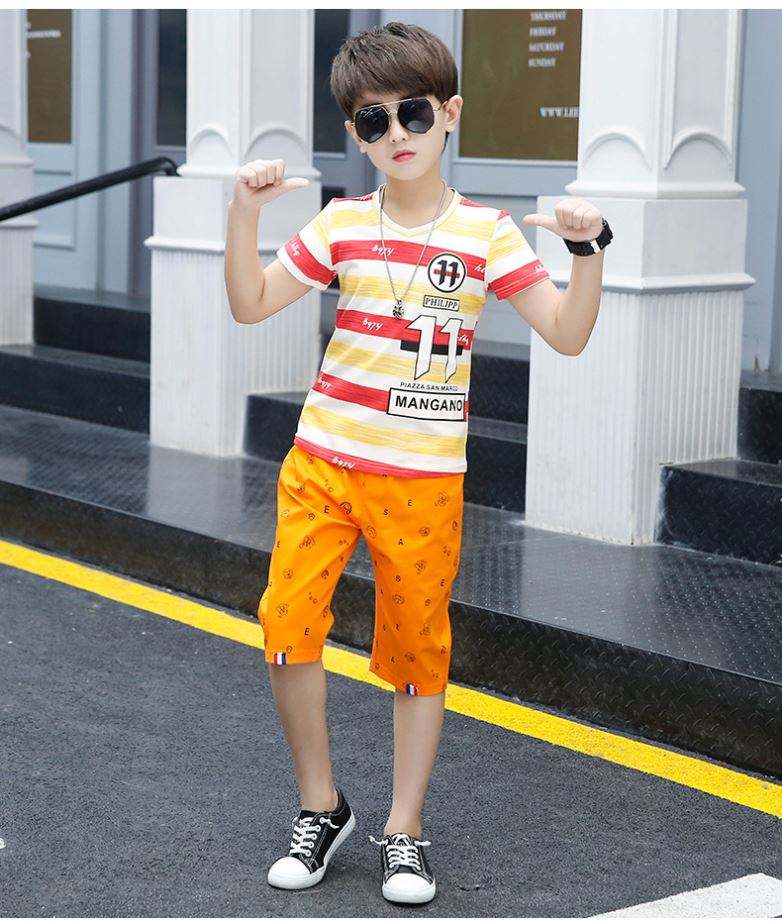 ชื่อ:บอดี้สูทแขนสั้นสำหรับเด็กผู้ชาย พร้อมลายตัวอักษรแบบแถบและกางเกงขาสั้นพิมพ์ลาย