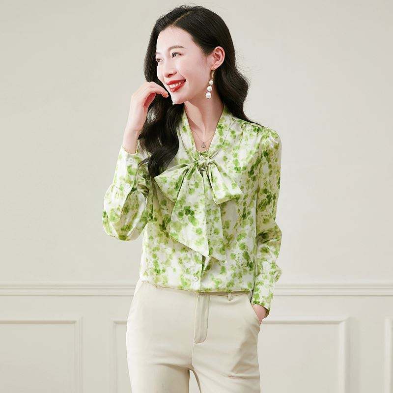เสื้อเชิ้ตผ้าไหมพิมพ์ลายสำหรับผู้หญิงผูกโบว์ผูกเชือกผูกโบว์แฟชั่นและหรูหราสำหรับฤดูใบไม้ผลิและฤดูร้อน