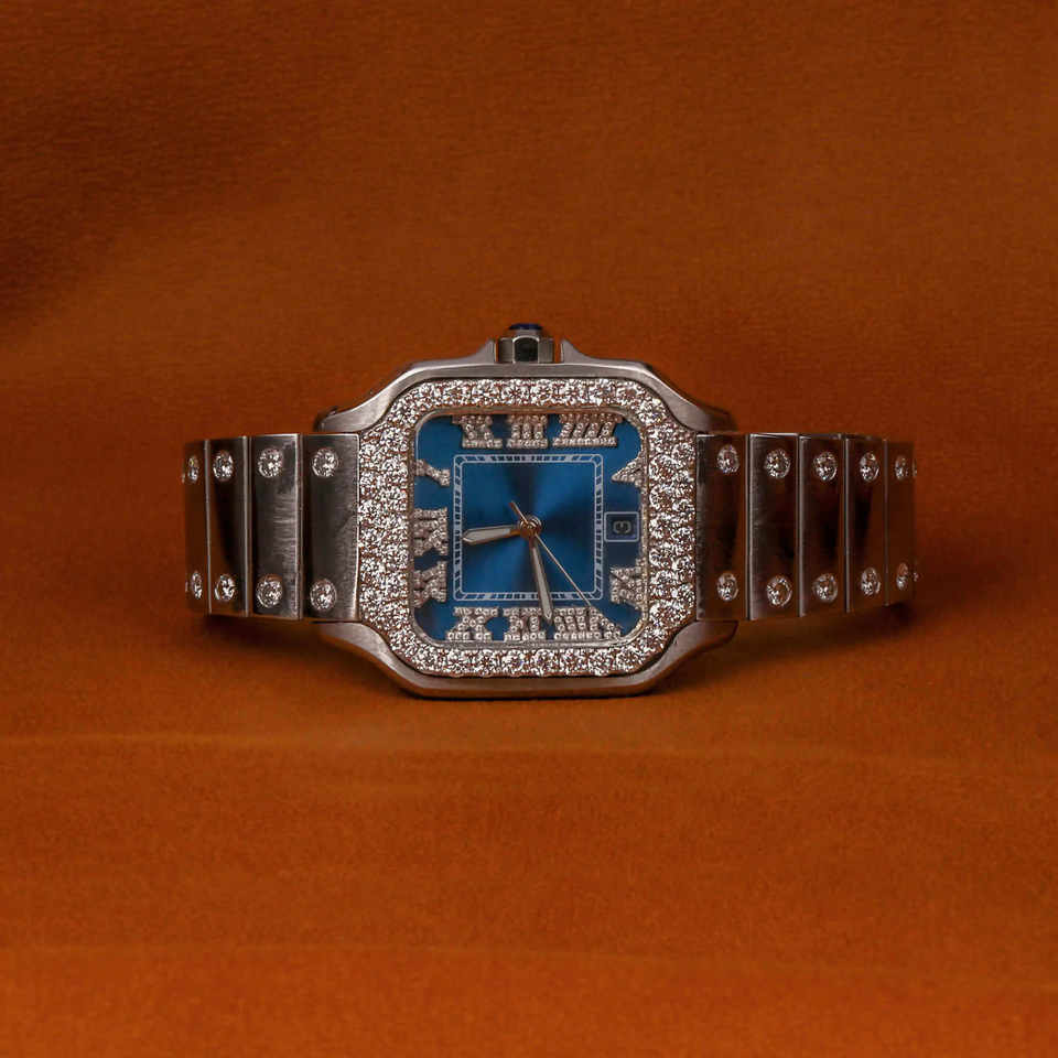 นาฬิกาข้อมือสแตนเลสสตีลหรูหรา ดีไซน์ใหม่ พร้อมกระจกสีน้ำเงินโรมันคุณภาพพรีเมียม ระบบกลไกแบบกลไก ตกแต่งแบบฮิปฮอป ประดับด้วยโมอิสซาไนต์