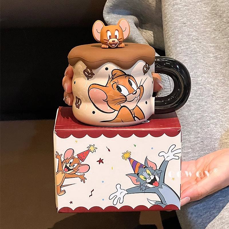 โอโวว์ ทอมแอนด์เจอร์รี่แก้วเซรามิกพร้อมฝาปิดลายการ์ตูนถ้วยเดี่ยวสำหรับของขวัญกาแฟชา